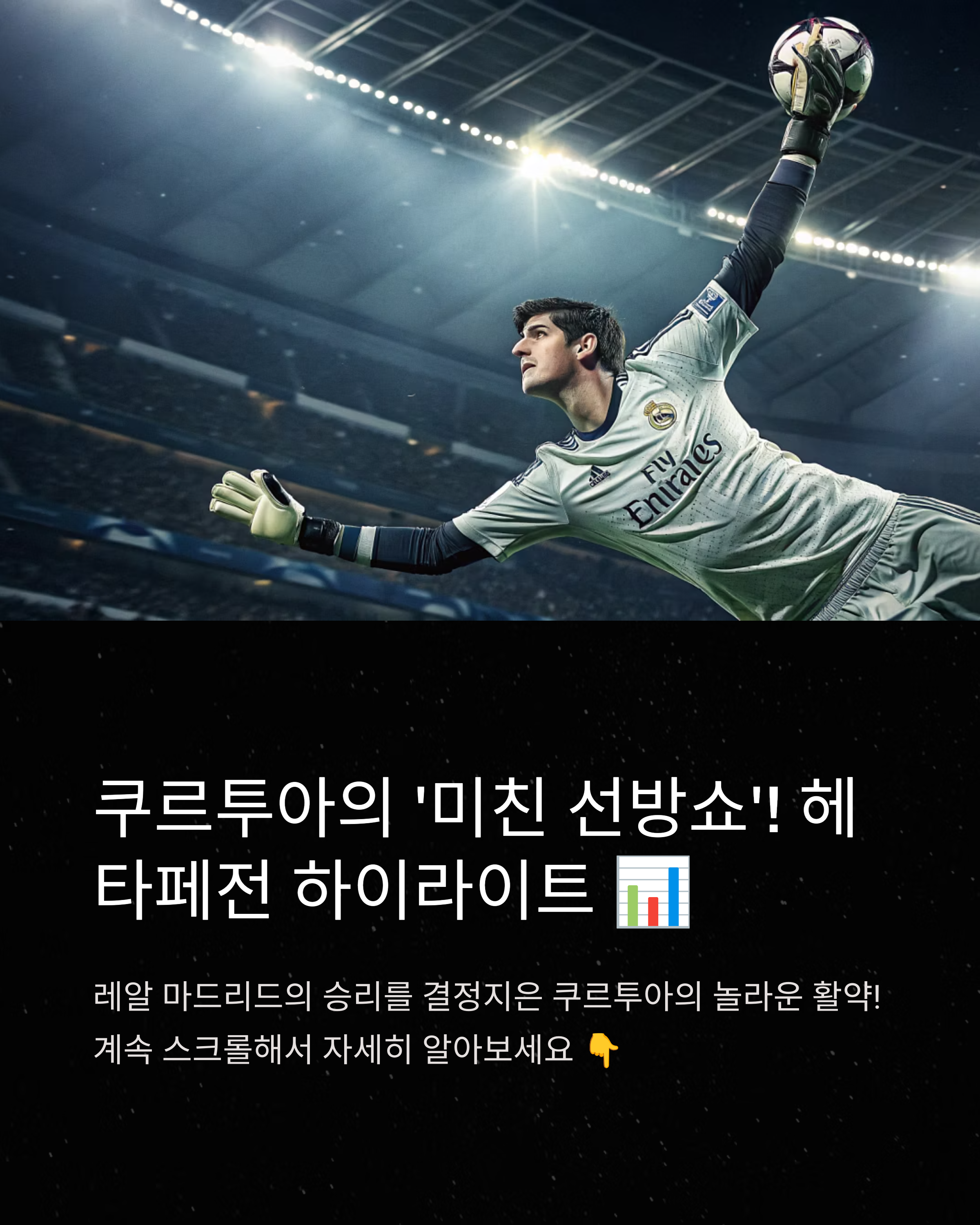 안녕하세요, 축덕 여러분! 어제 새벽 경기 보셨나요? 레알 마드리드 팬이라면 아직도 심장이 쿵쾅댈 텐데요. 바로 ‘쿠르투아 선방쇼’ 때문입니다. 기대득점(xG)만 무려 2.32였던 헤타페의 공격을 단 하나도 허용하지 않은 그의 활약, 정말 눈을 의심케 했습니다. 이 포스트에서는 경기 리뷰부터 쿠르투아의 퍼포먼스 분석, 평점, 팬 반응까지 총정리해드릴게요!