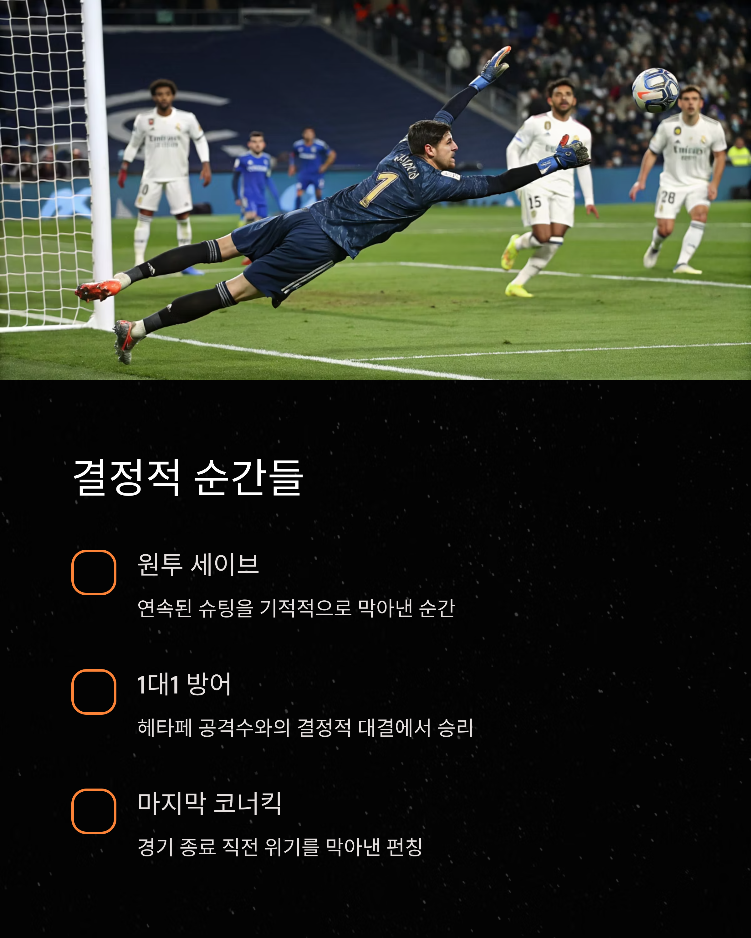 헤타페의 xG는 2.32로, 경기 흐름상 2골 이상은 충분히 기대할 수 있는 수치였습니다. 그러나 쿠르투아는 다음과 같은 장면에서 슈퍼세이브를 선보였습니다: