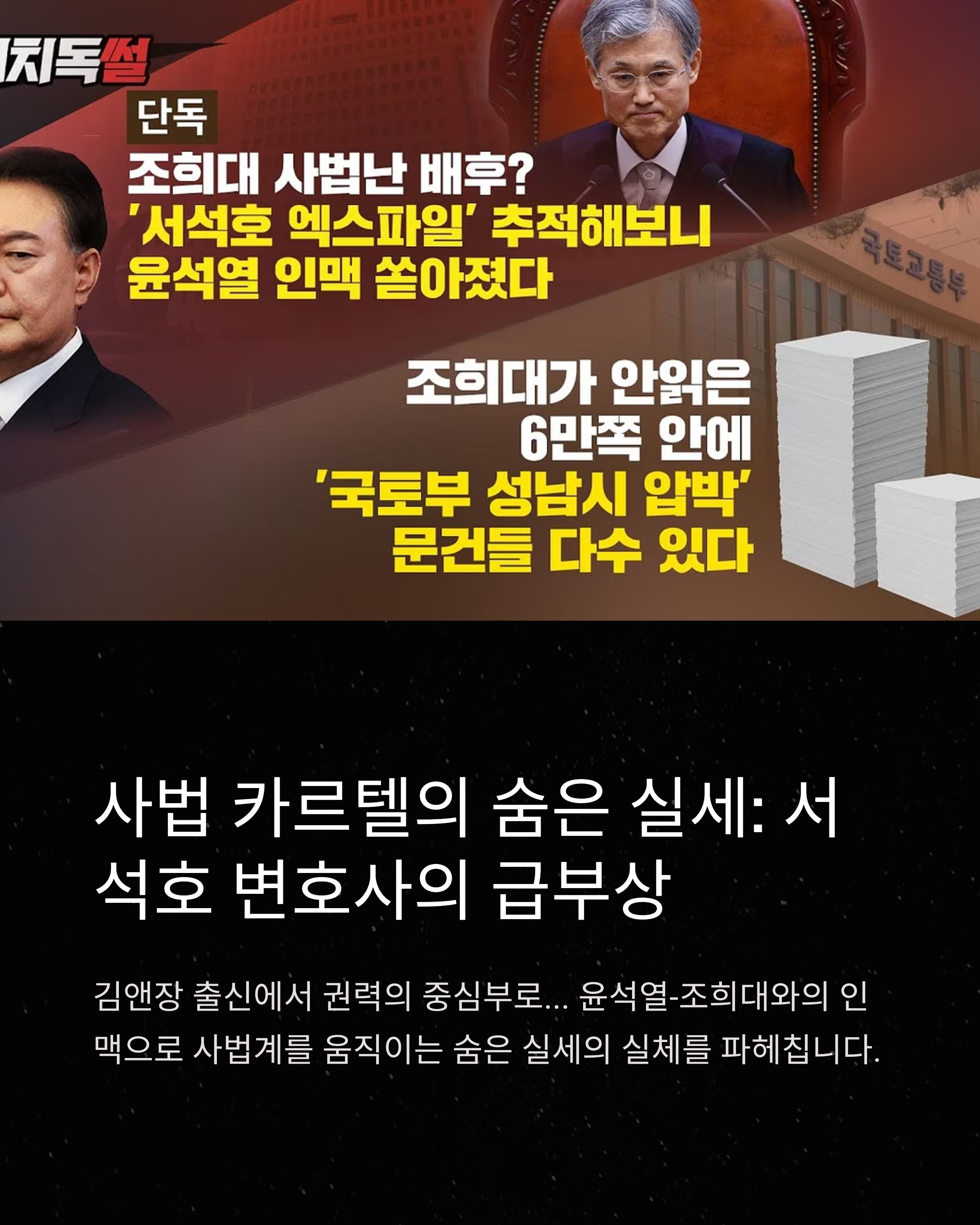 서석호 변호사가 급부상한 배경에는 ‘사법 카르텔’이라는 단어가 있습니다. 검찰 출신 대통령, 동문 중심의 대법원, 전관계 거물 로펌 출신 인사라는 점이 하나의 서사로 얽히며 대중의 의심을 키운 것이죠.