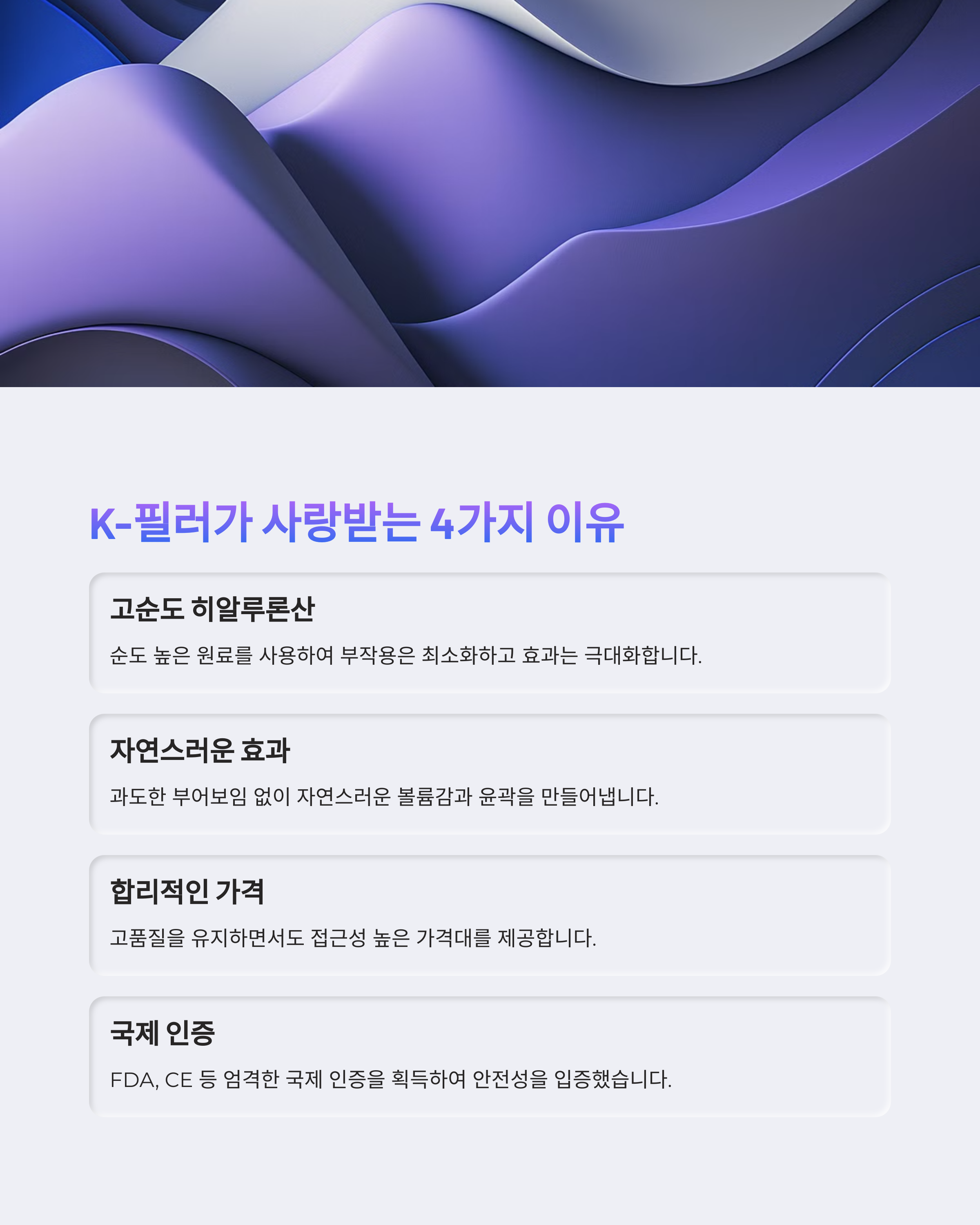 고품질의 히알루론산 사용, 가격 경쟁력, 자연스러운 결과, 그리고 미국 FDA 및 유럽 CE 인증 획득 덕분입니다.