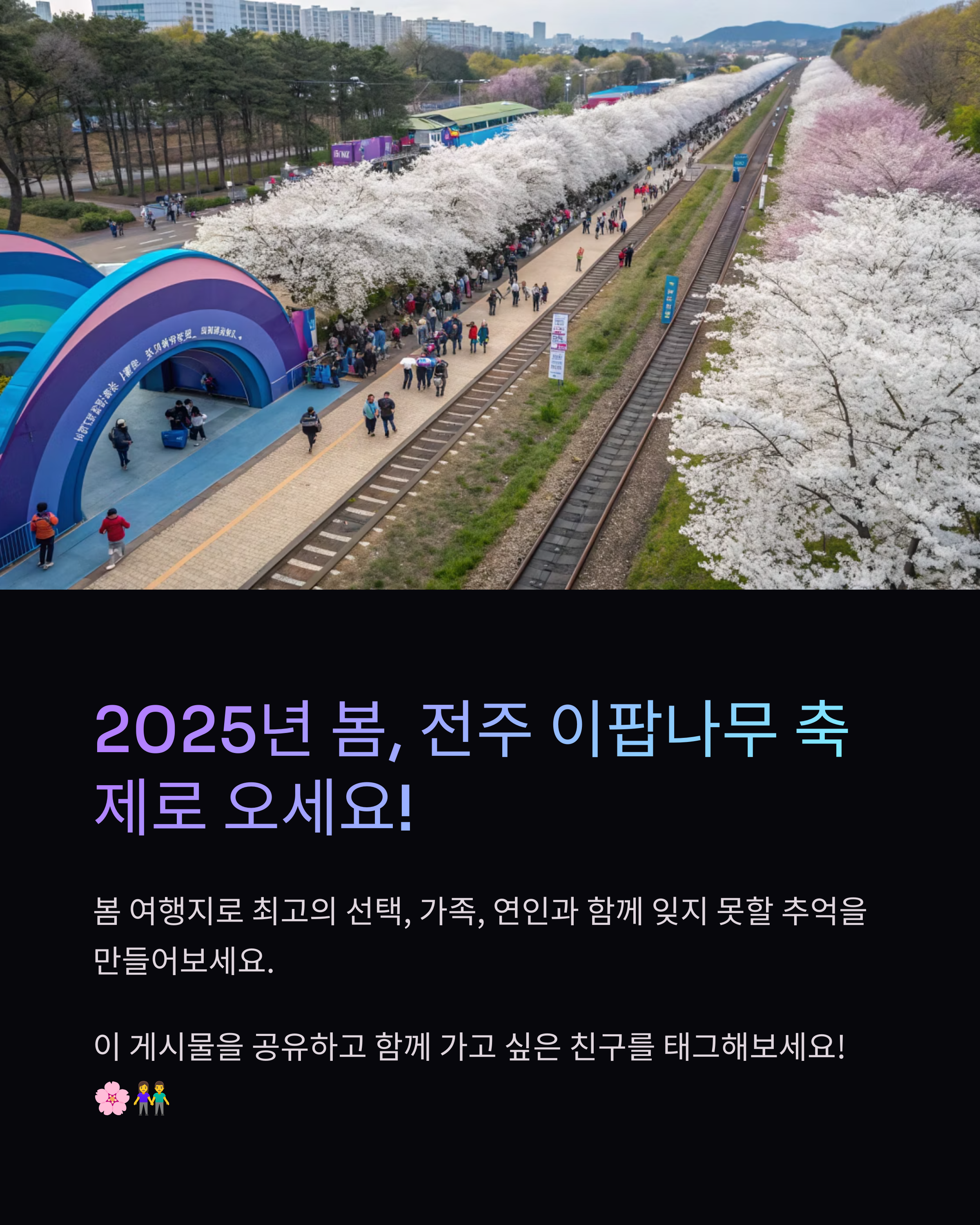 올해 전주 팔복동 이팝나무철길, 진짜 말도 안 되게 예뻤습니다. 축제 기간 동안은 꽃과 조명, 그리고 사람들의 웃음소리로 가득했어요. 여행 계획하고 계신 분들, 이번 주말이라도 짧게 다녀오시면 인생샷과 힐링 모두 잡을 수 있을 거예요. 특히 2025년부터 확 바뀐 프로그램들 덕분에, 훨씬 풍성하고 세련된 느낌이었습니다. 다음에 또 어떤 멋진 변화가 있을지 벌써부터 기대되네요. ✨ 모두들 봄날을 마음껏 만끽하세요!