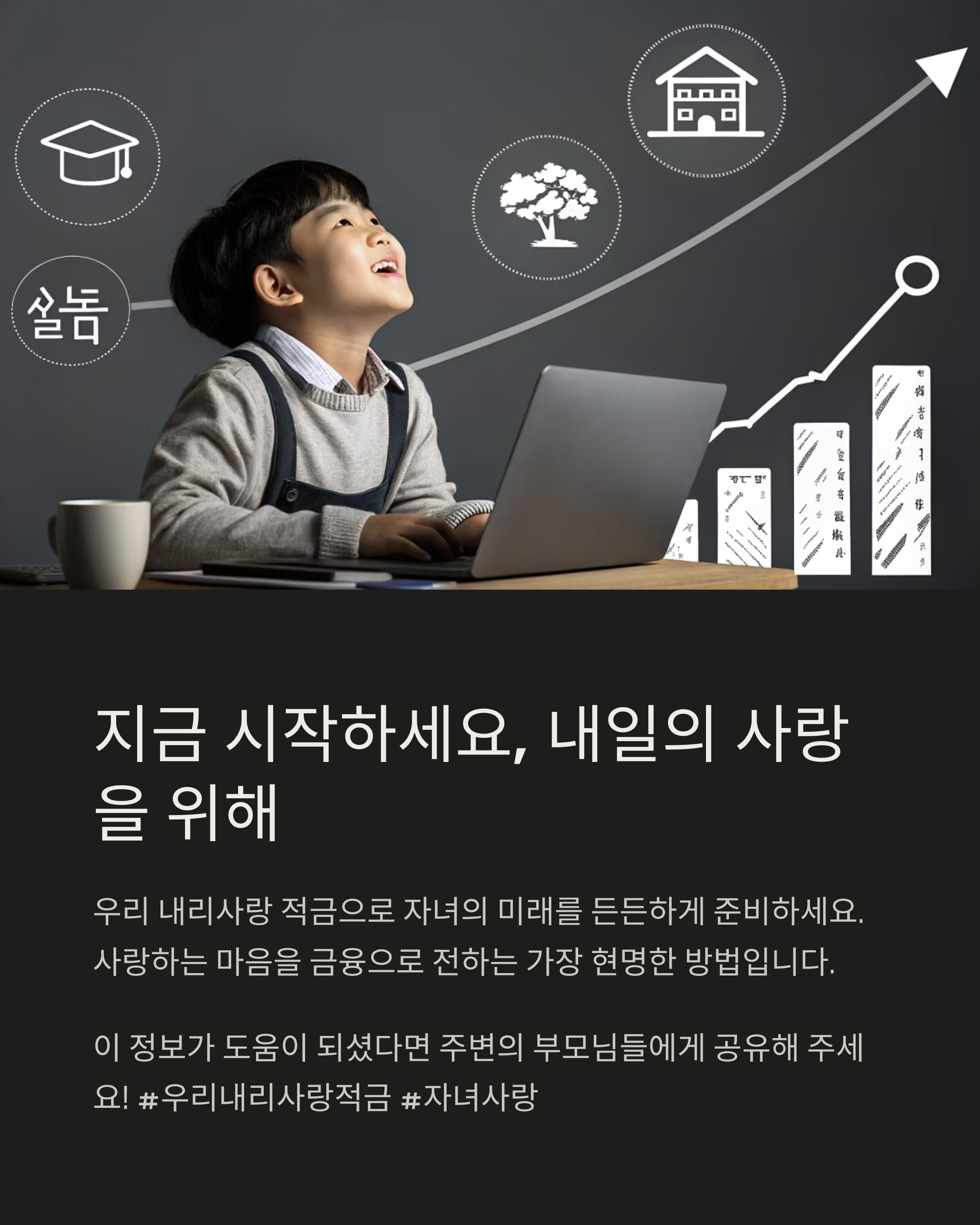 ‘우리 내리사랑 적금’은 단순한 적금 이상의 의미를 지닙니다. 고금리 혜택을 제공하면서도, 부모나 조부모가 직접 가입 코드를 발급해 자녀나 손주에게 전달함으로써 세대 간 유대감을 형성하는 계기를 마련해줍니다. 특히 최근 고물가 상황에서 실질 수익률이 높은 저축 수단으로 주목받고 있으며, 자녀 재테크 입문의 첫걸음으로도 적합한 상품입니다.