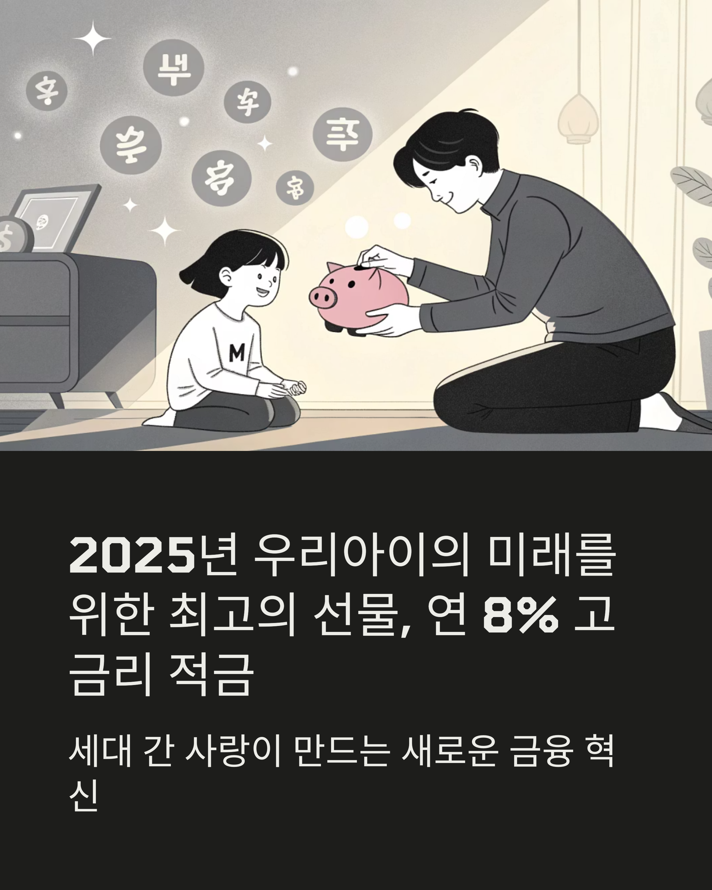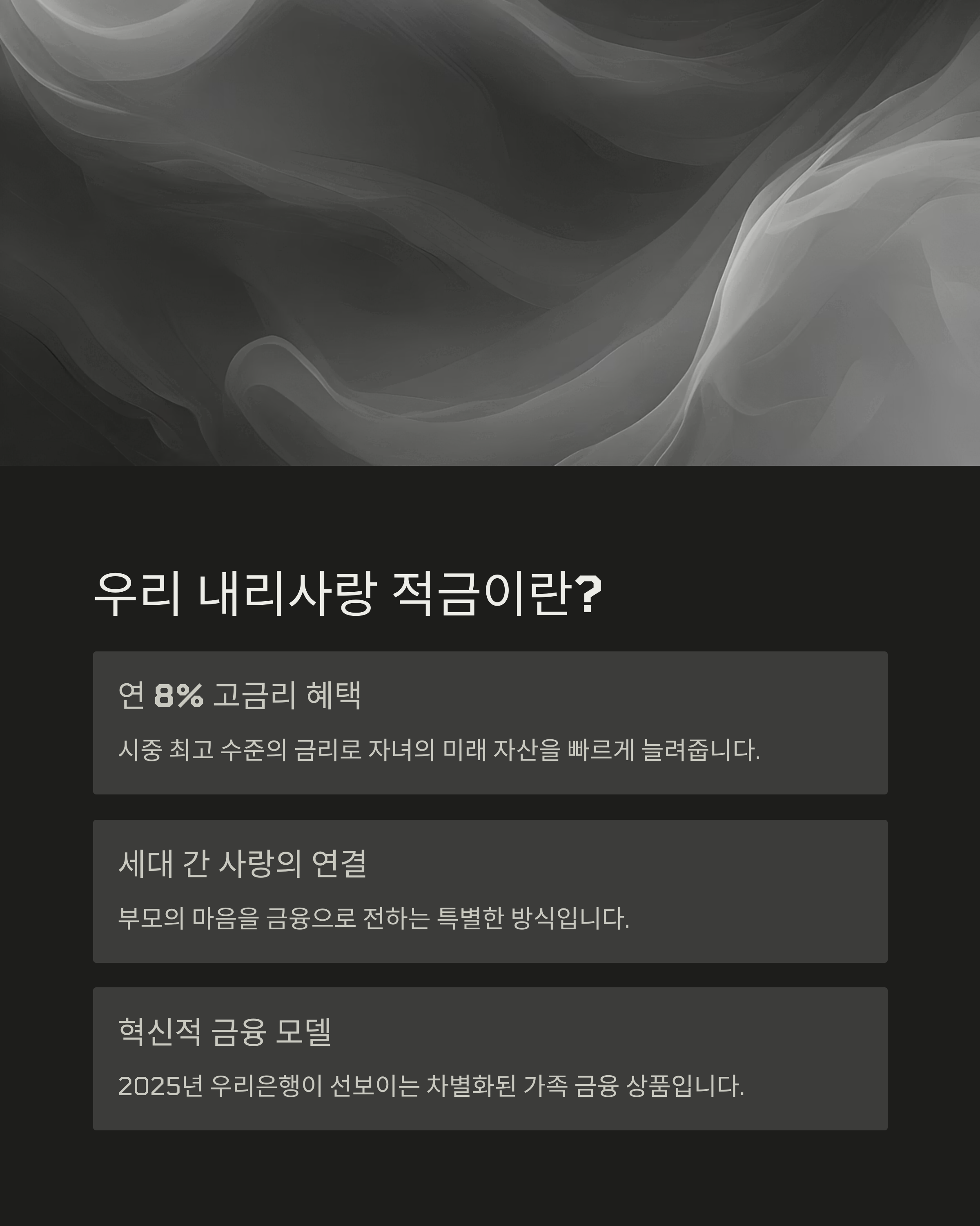 2025년 5월, 우리은행이 선보인 '우리 내리사랑 적금'은 부모 세대가 자녀에게 연 8% 금리 혜택을 선물할 수 있는 특별한 금융 상품입니다. 세대 간 사랑을 금융으로 표현하는 이색적인 적금 상품을 지금 만나보세요.