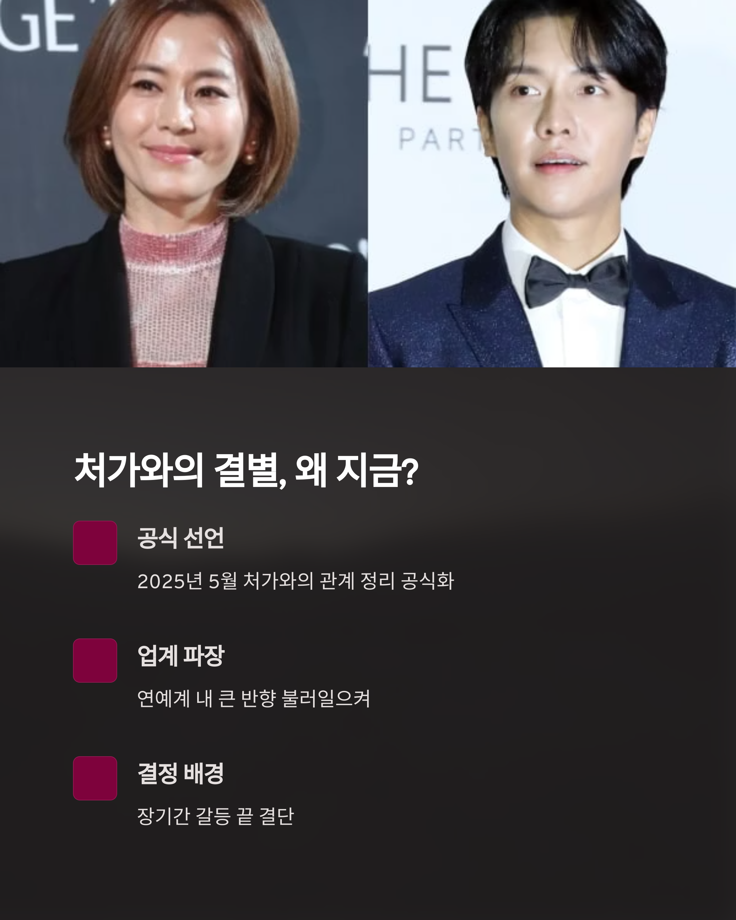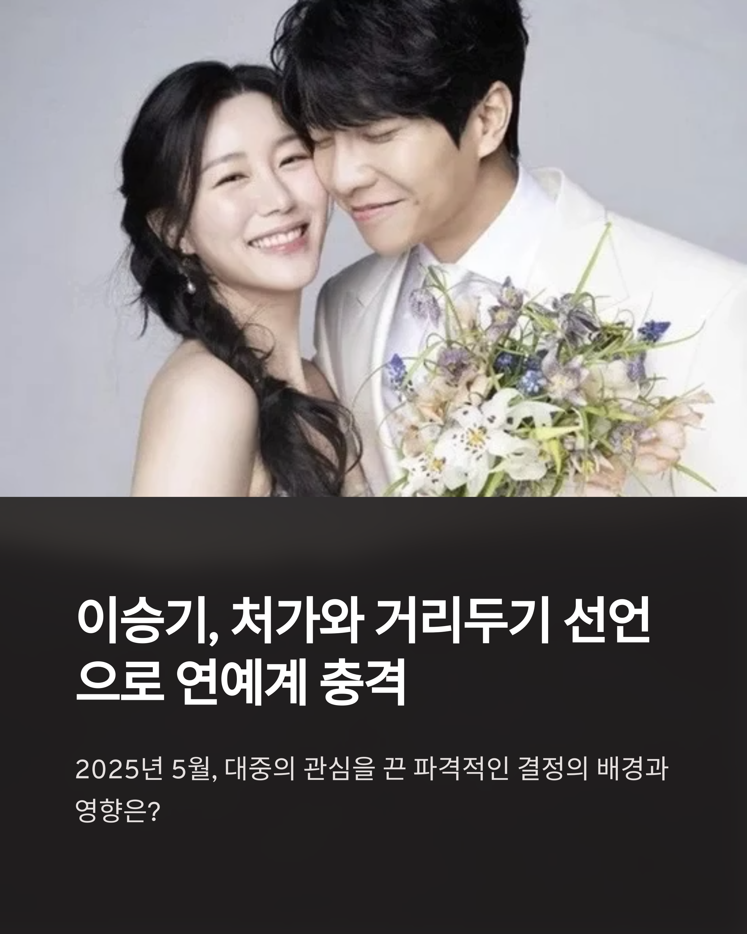 2023년 결혼 후, 이승기는 견미리 가족과 밀접한 관계를 유지해왔습니다. 그러나 견미리 가족 관련한 과거 논란(주식 내부자 거래 의혹 등)이 재조명되면서, 이승기 이미지에도 타격이 있었다는 평가가 많았죠. 결국 2025년 5월, 이승기는 "처가와 거리를 두기로 했다"는 공식 입장을 발표했습니다. 이승기 특유의 신중한 이미지와 대비되며 파장이 커졌어요.