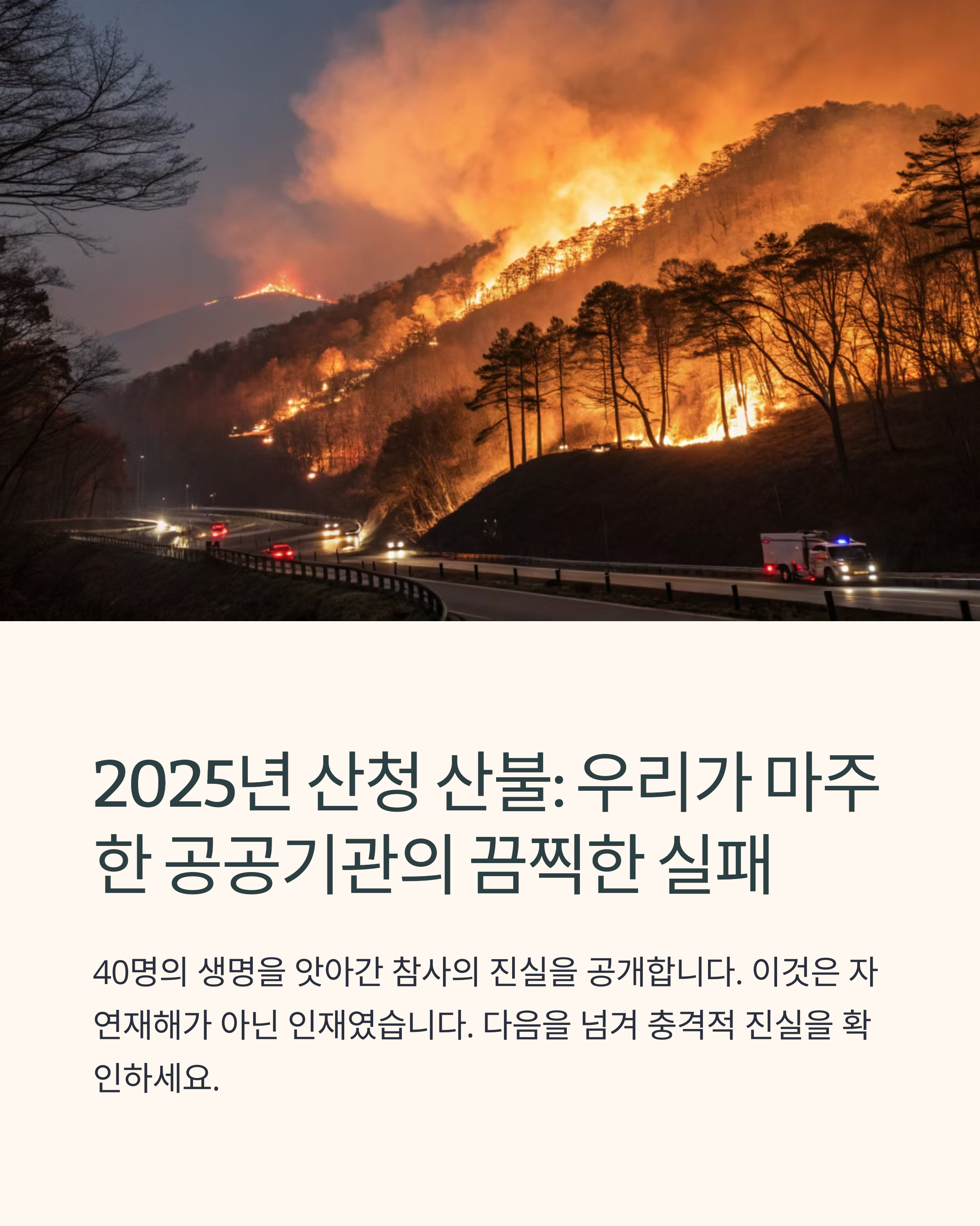 산불은 자연재해지만, 이번 산청 산불은 너무도 인재(人災)에 가까웠습니다. 생존자들의 “우리는 그냥 불 속으로 밀려들어갔다”는 말은 단순한 울분이 아니라 우리 시스템이 사람을 어떻게 다루는지를 보여주는 슬픈 단면입니다. 이제는 단지 복구를 넘어서, 제도와 문화 자체를 바꿔야 할 때입니다. 여러분의 생각은 어떠신가요? 댓글로 함께 이야기 나눠요.