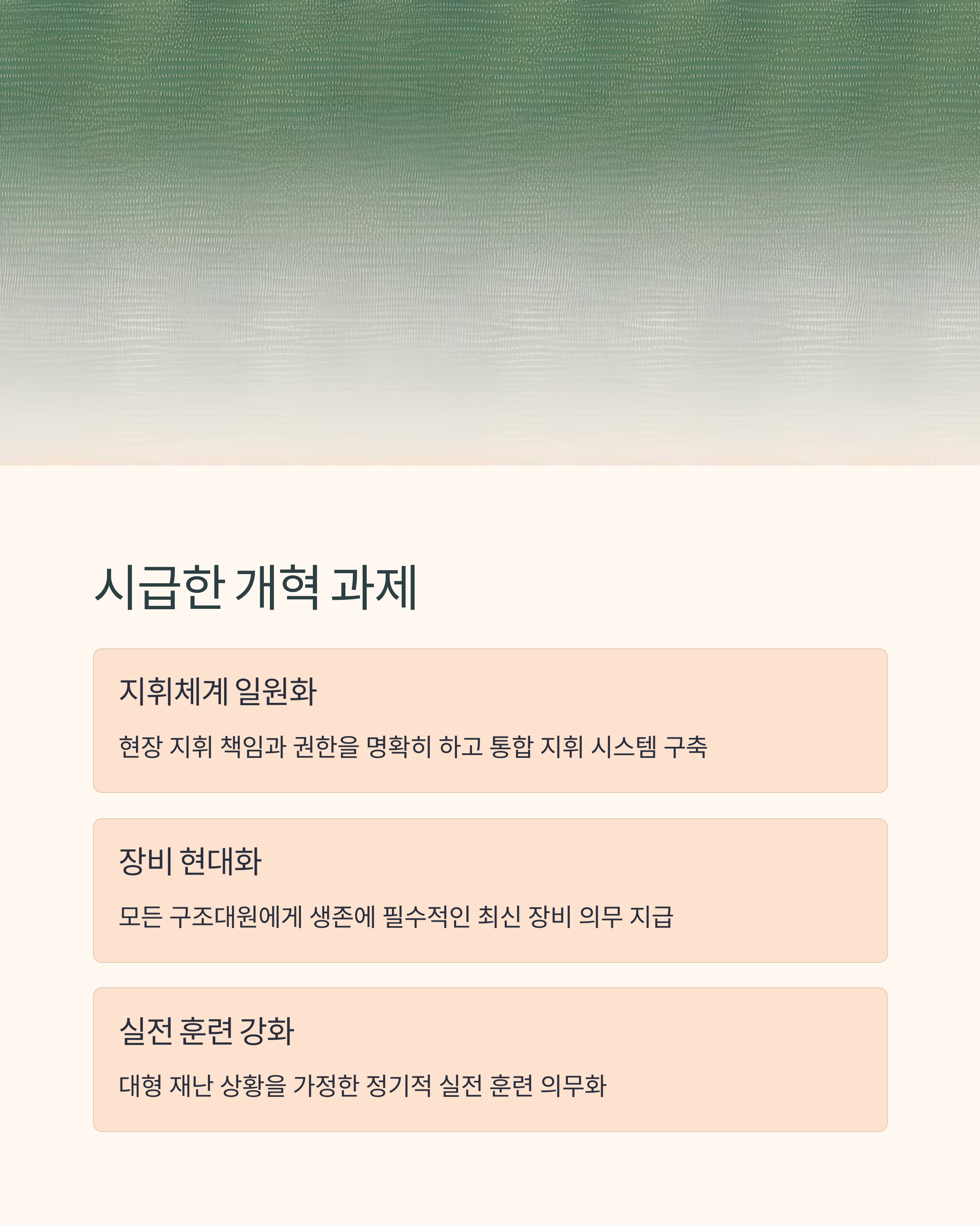 이런 참사는 절대 반복되어선 안 됩니다. 단순 장비 확충을 넘어서, 지휘 체계와 실질적 훈련, 대응 시나리오 수립까지 전방위적 개혁이 시급합니다. 다음은 개선을 위한 핵심 제안입니다.