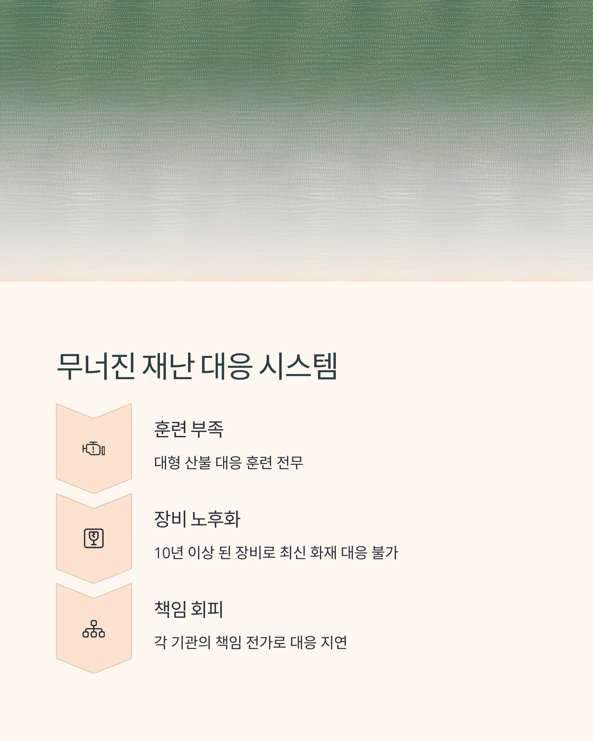 산불 현장에 투입된 일부 인력은 소방복은커녕 방진 마스크도 없이 진화 작업에 나선 것으로 드러났습니다. 소방청과 산림청 간 지휘 체계도 엇갈려, 구조 요청은 제때 전달되지 못했고, 불길은 그대로 민가로 향했습니다. 아래는 당시 확인된 주요 장비 및 대응 실패 목록입니다.