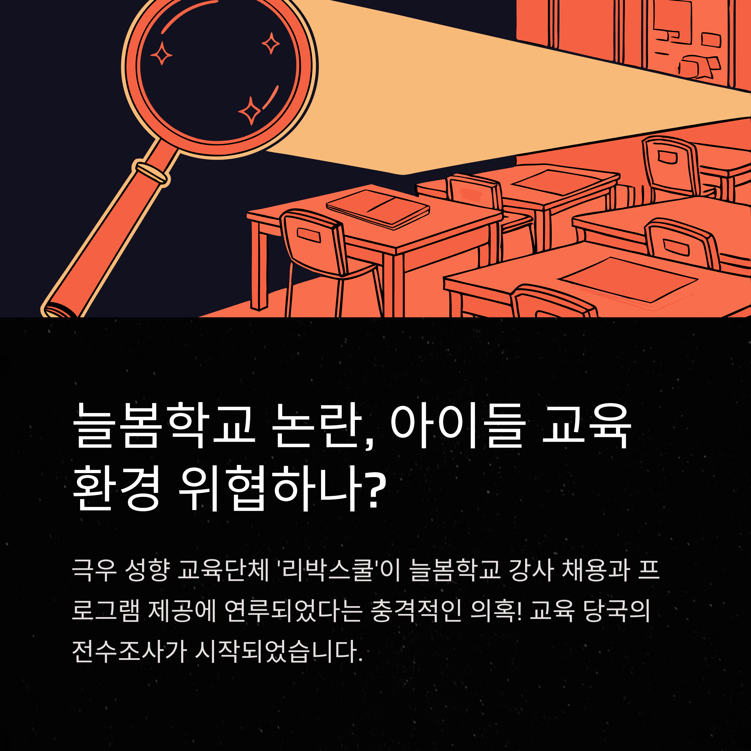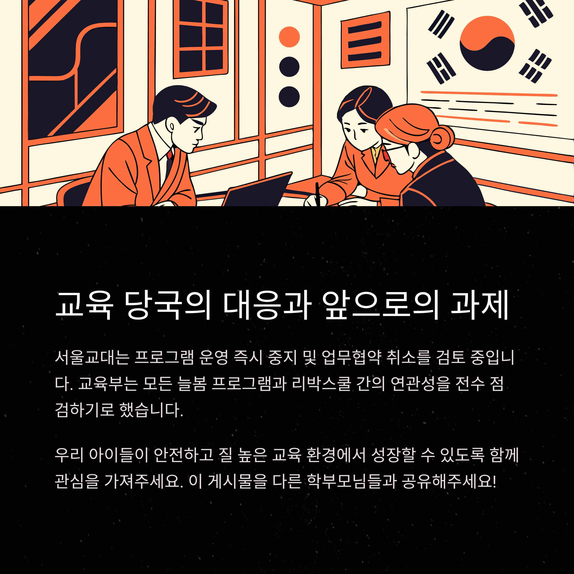 3. 교육 당국 대응: 서울교대 프로그램 운영 즉시 중지 및 업무협약 취소 검토. 교육부, 모든 늘봄 프로그램과 리박스쿨 간 연관성 전수 점검 돌입.