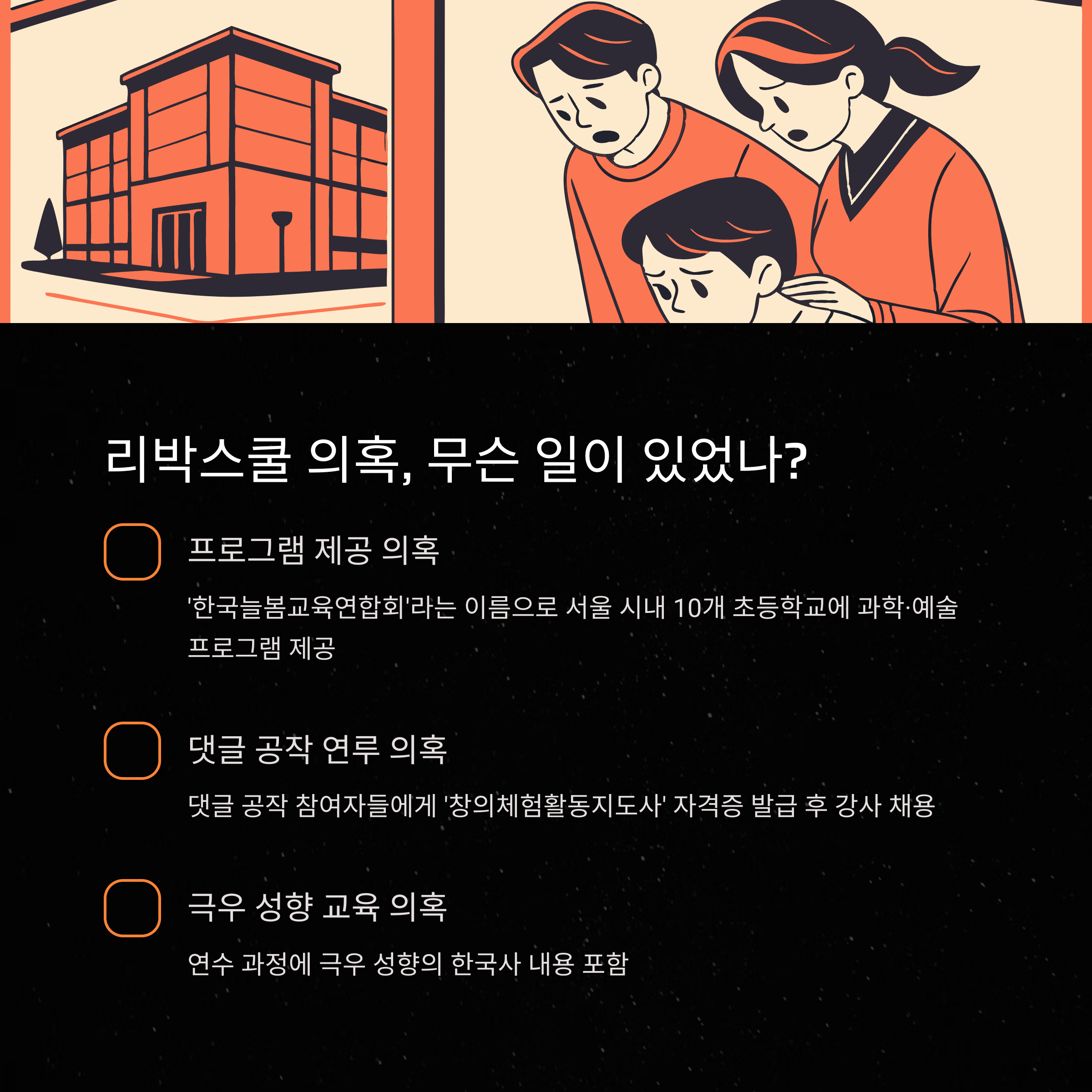 1. 의혹의 시작: 극우 성향 교육단체 '리박스쿨'이 서울교대와 협약하여 서울 늘봄학교에 과학·예술 프로그램 제공.