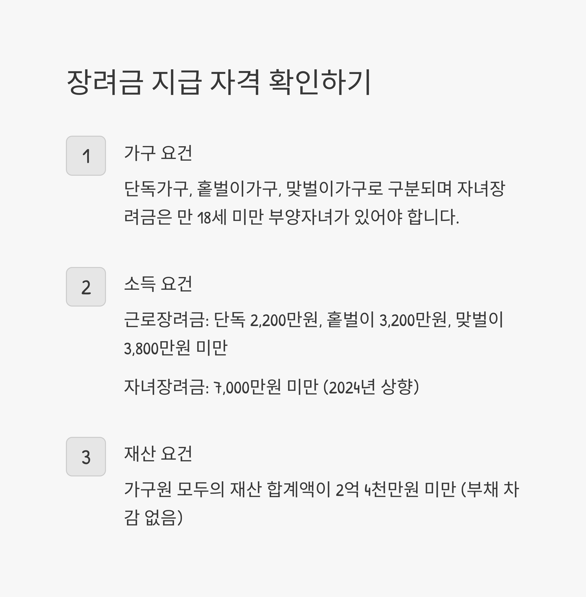 장려금을 받으려면 크게 세 가지 요건(가구원, 소득, 재산)을 모두 충족해야 해요. 제가 간단한 표로 정리해봤으니, 나에게 해당되는지 한 번 확인해보세요!