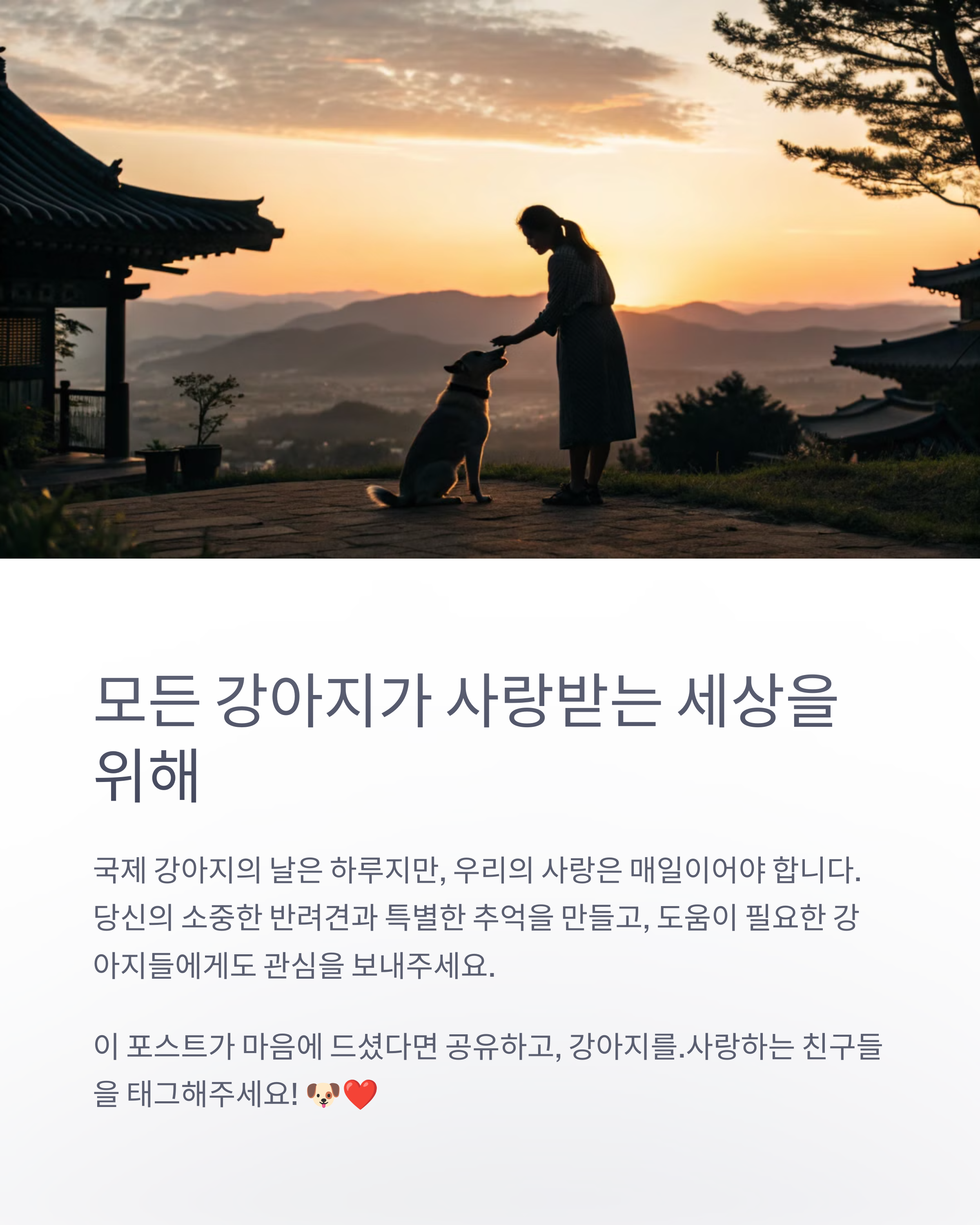 국제 강아지의 날은 단순한 기념일을 넘어서, 반려동물과의 유대를 다시 한 번 확인하고 유기견 문제에 대해 함께 고민해볼 수 있는 소중한 기회예요. 오늘 하루만큼은 바쁜 일상에서 벗어나 우리의 댕댕이에게 ‘너는 나에게 얼마나 소중한 존재인지’를 표현해보는 건 어떨까요? 사랑은 표현할 때 더욱 따뜻해지고, 함께한 기억은 우리 마음속에 오래도록 남는 법이니까요. 모든 강아지가 행복해지는 그날까지, 우리 함께할게요.