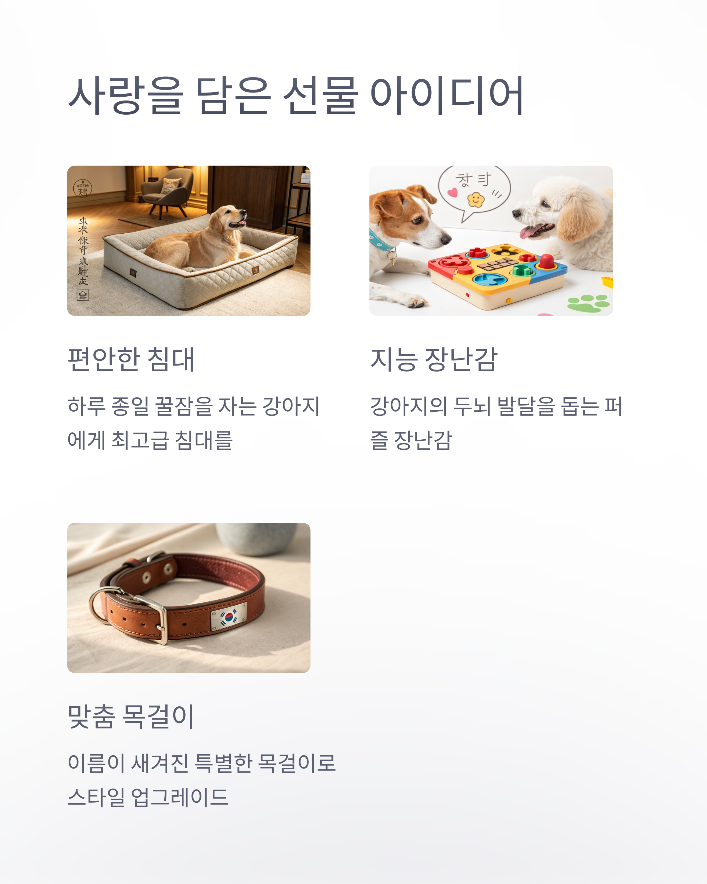 작은 선물이라도 ‘내가 널 얼마나 아끼는지’를 표현하는 계기가 될 수 있어요. 선물은 마음이라는 말, 반려견에게도 통하니까요!
