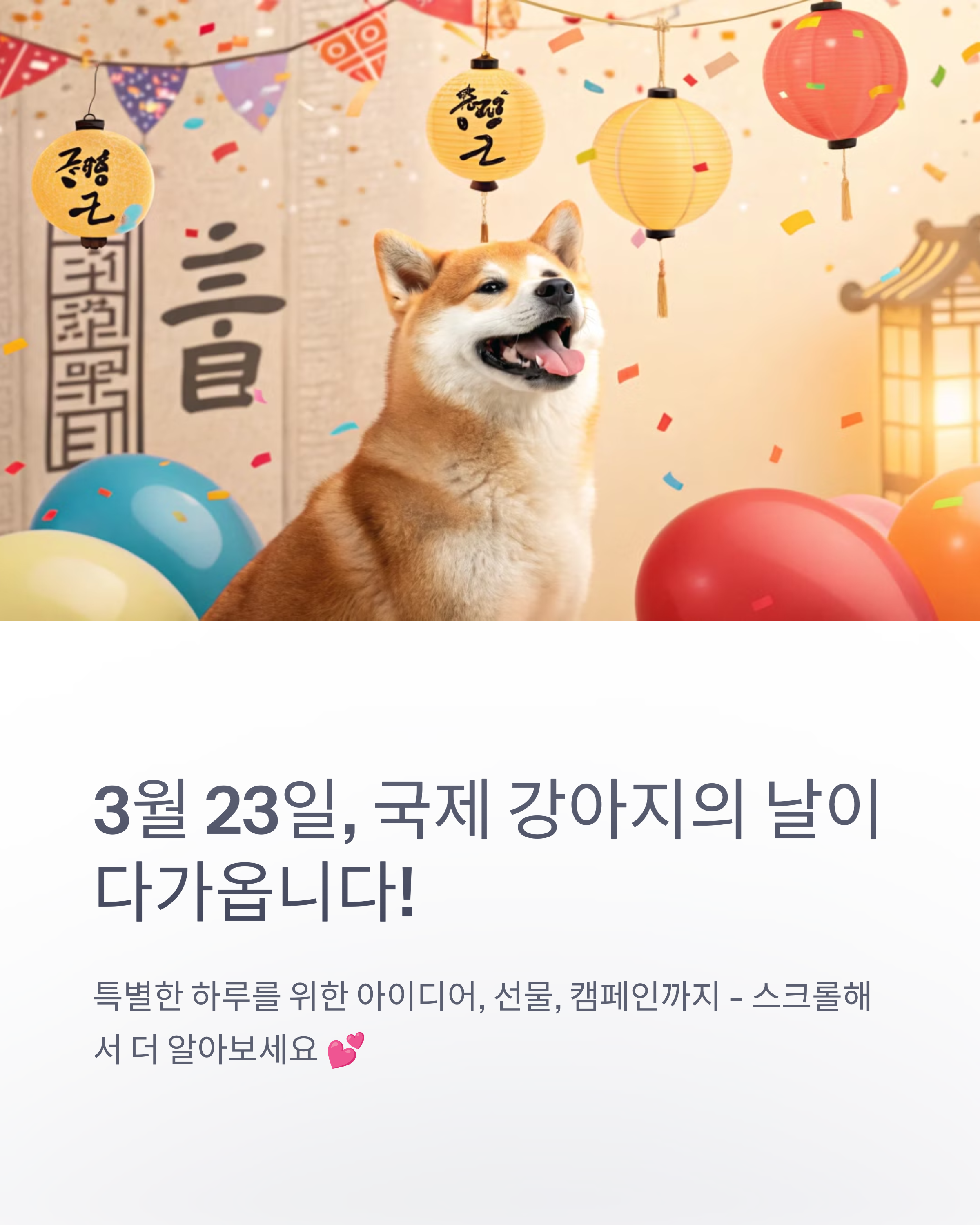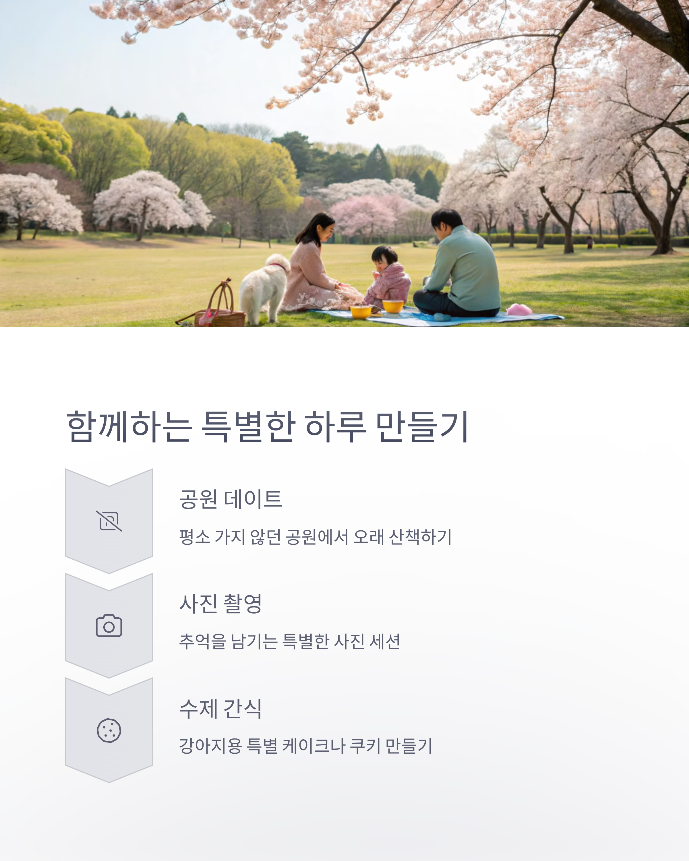무엇보다 중요한 건 강아지가 가장 좋아하는 것, 바로 ‘함께하는 시간’이에요. 특별한 날만큼은 일상의 루틴을 잠시 멈추고, 온전히 강아지에게 집중해보는 건 어떨까요?