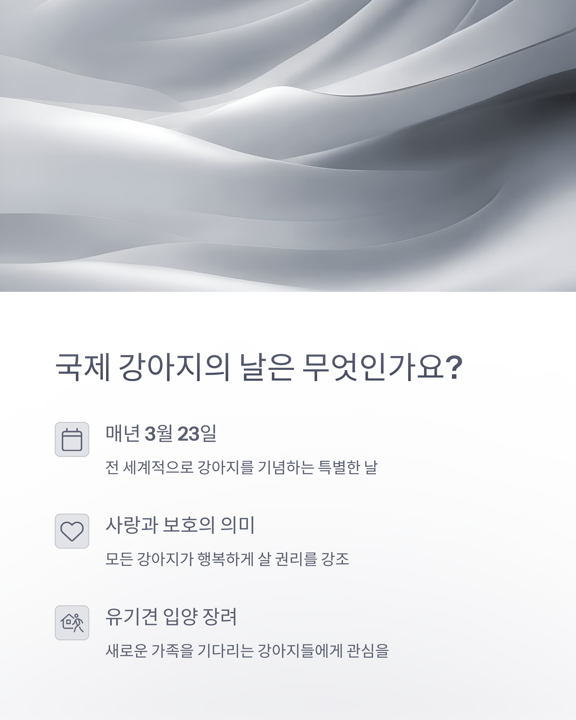 - 국제 강아지의 날은 유기견 보호소에서 입양을 권장하는 취지를 가지고 있어요.