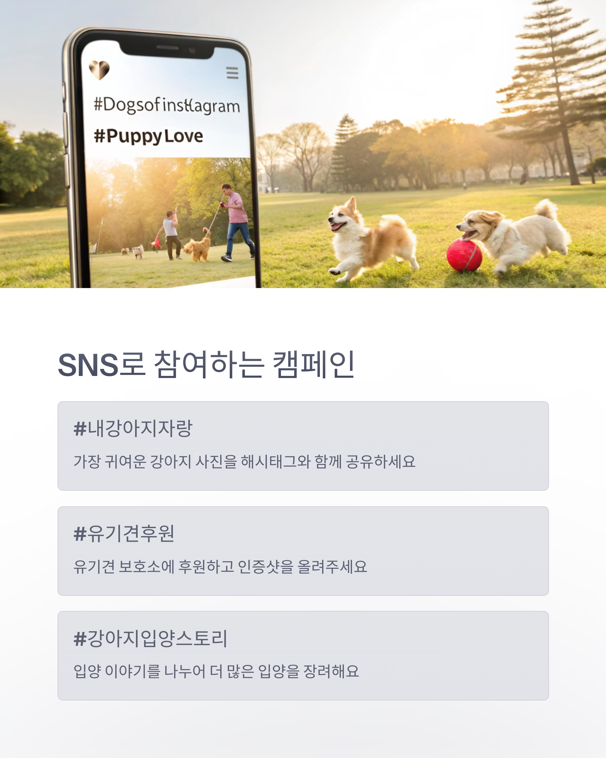 #PuppyDay, #AdoptDontShop 등의 해시태그로 반려견 사진을 공유하거나 입양 캠페인 포스팅에 참여할 수 있어요.