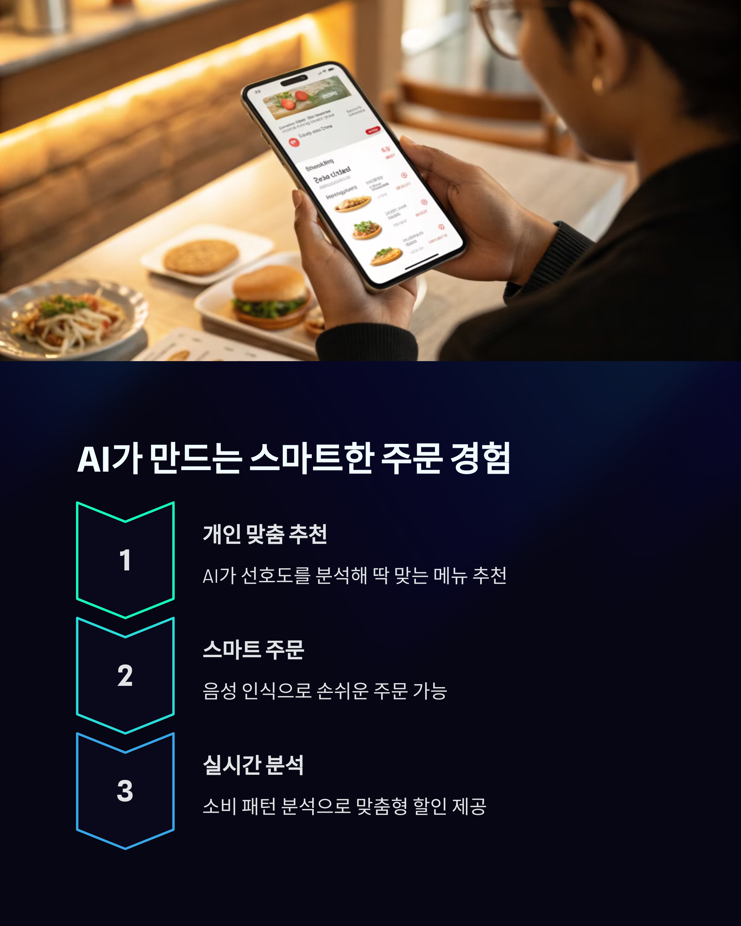 주문 패턴 분석을 통한 추천 시스템, 리뷰 감성 분석, 음성 주문 기능 등 다양한 방식으로 활용될 수 있습니다.