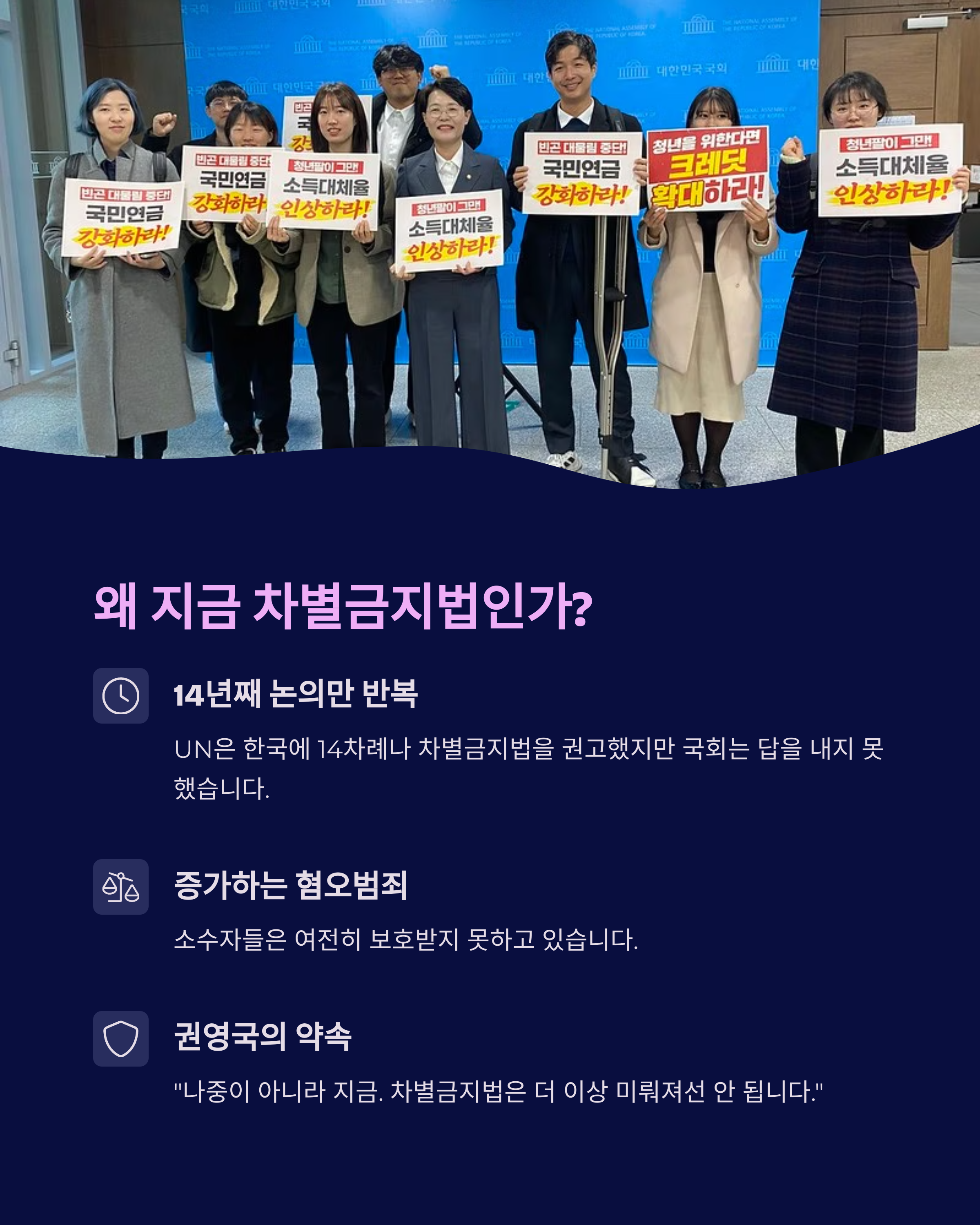 차별금지법 제정은 14년째 논의만 반복되고 있습니다. 그 사이 혐오 범죄는 증가했고, 소수자들은 여전히 보호받지 못하고 있어요. UN은 한국에 무려 14차례나 차별금지법을 권고했지만, 국회는 답을 내지 못했습니다.