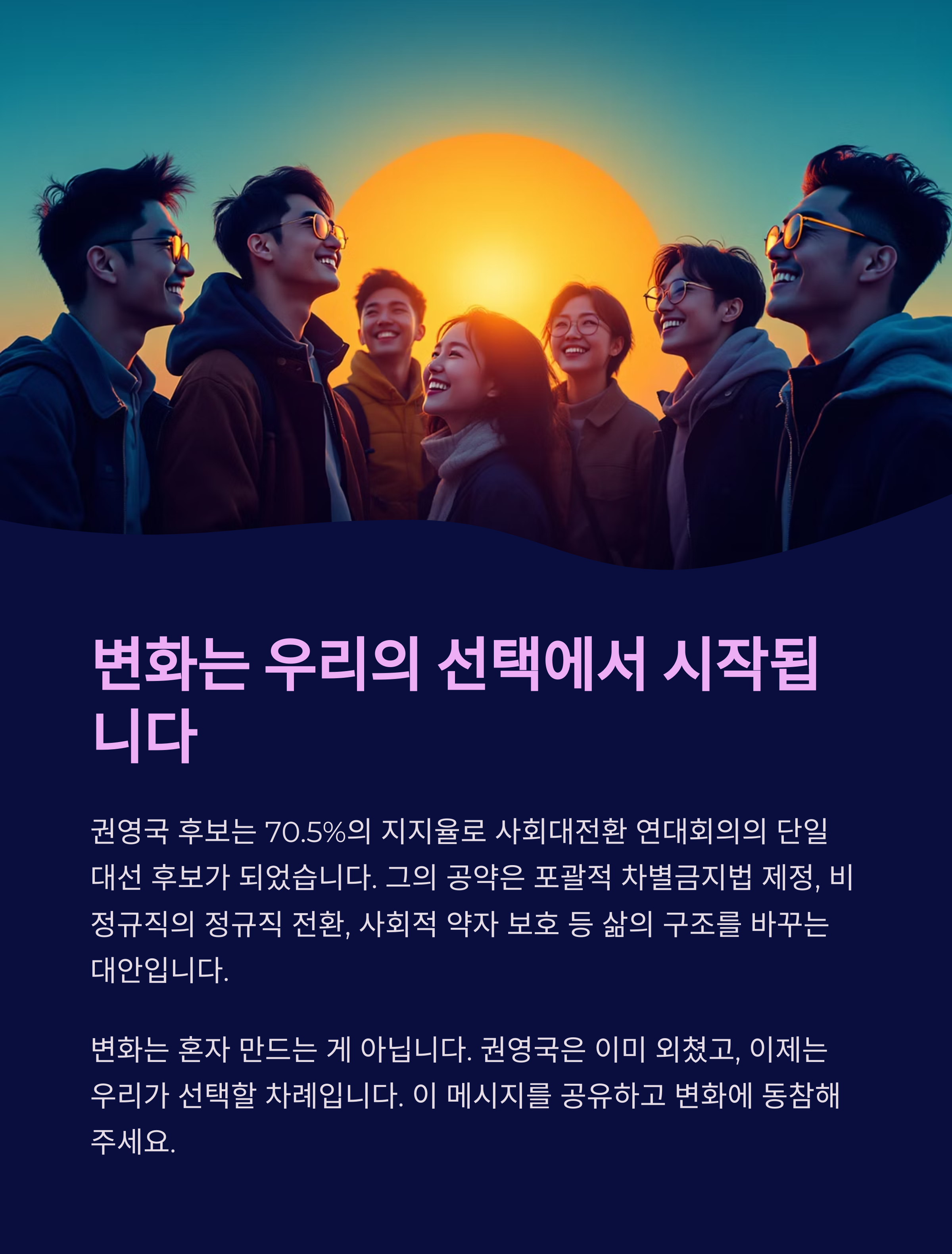 변화는 혼자 만드는 게 아닙니다. 누군가 먼저 외치고, 우리가 그 외침에 귀 기울일 때 시작되죠. 권영국 후보는 이미 외쳤습니다. 이제는 우리가 선택할 차례입니다.