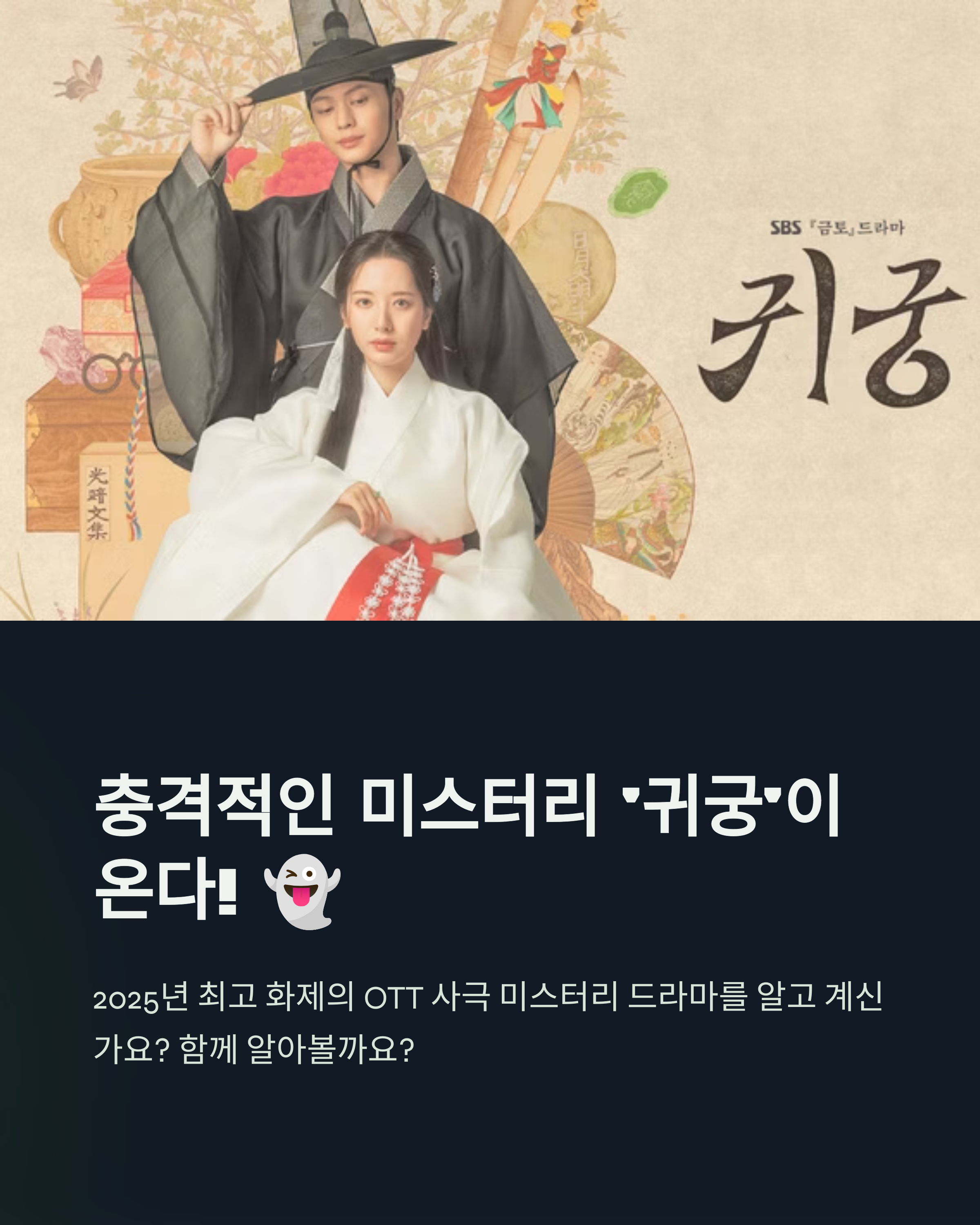 2025년 중후반부에 시즌2 소식도 들려올 수 있다는 이야기가 슬슬 돌고 있는데요! 귀궁의 세계관이 더 확장되기를 바라며, 다음 글에서는귀궁 속 ‘궁중 비술과 금기의 상징들’을 집중 분석해볼 예정이니 꼭 기대해주세요 😊
