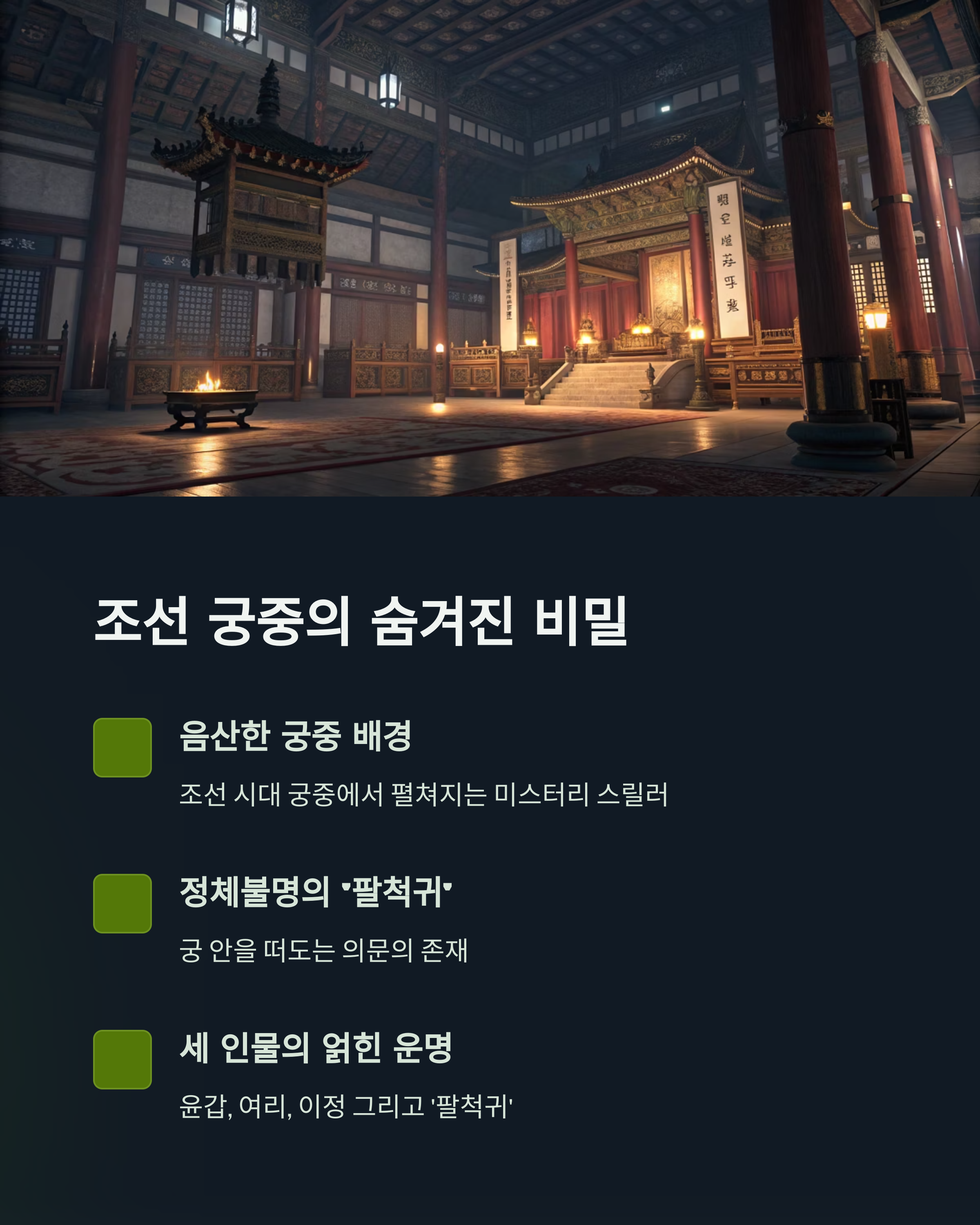 조선 후기의 궁궐에서 벌어지는 괴이한 사건들. 그 중심에는 윤갑, 여리, 이정이라는 세 인물이 있습니다. 윤갑은 내금위의 무관이자 궁의 질서를 지키는 인물로, 정체불명의 존재 ‘팔척귀’와의 첫 조우를 하게 됩니다. 여리는 궁에서 일하는 무녀이자, 팔척귀에 얽힌 금기된 설화를 유일하게 알고 있는 인물. 이정은 조정의 권력자 후손으로, 궁 내 정치 싸움과 괴현상의 이면에 깊숙이 얽혀 있죠.