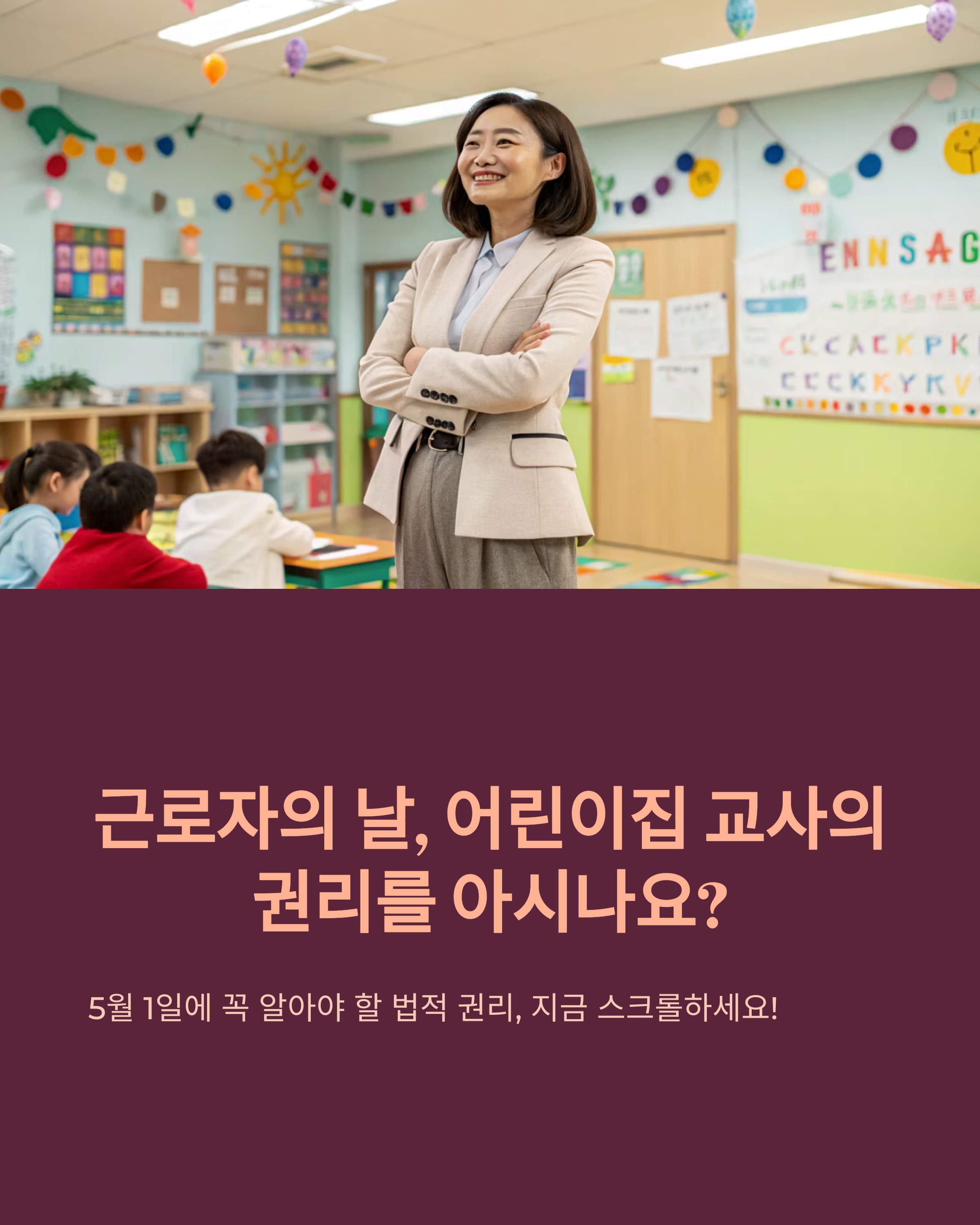 근로자의 날, 어린이집 교사로서 출근해야 한다면 꼭 기억하세요! 유급휴일 보장, 추가수당, 보상휴가는 법이 보장한 정당한 권리입니다. ‘아이들을 위한 일이니까 괜찮다’는 마음도 소중하지만, 그만큼 본인의 권리도 존중받아야 하니까요. 이 글이 여러분의 현명한 권리 보호에 도움이 되길 바랍니다. 💚