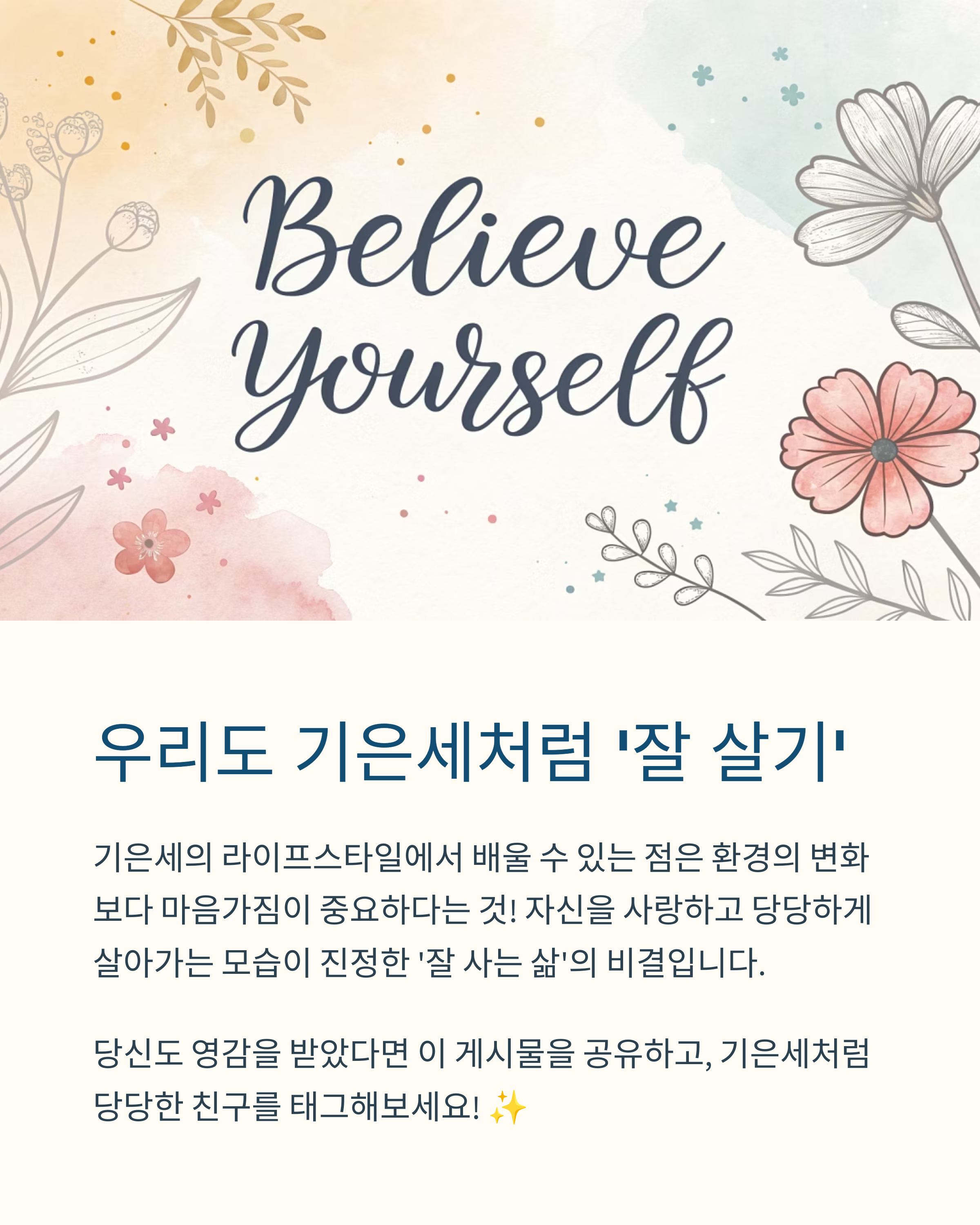 오늘 함께 살펴본 기은세의 이야기를 통해 단순히 화려한 삶만이 아닌, 자신을 지키고 가꾸는 삶의 가치에 대해 다시 한 번 생각해보게 되었어요. 저도 방송 보면서 ‘아 나도 저렇게 살고 싶다’는 생각이 절로 들더라구요. 여러분은 어떠셨나요?