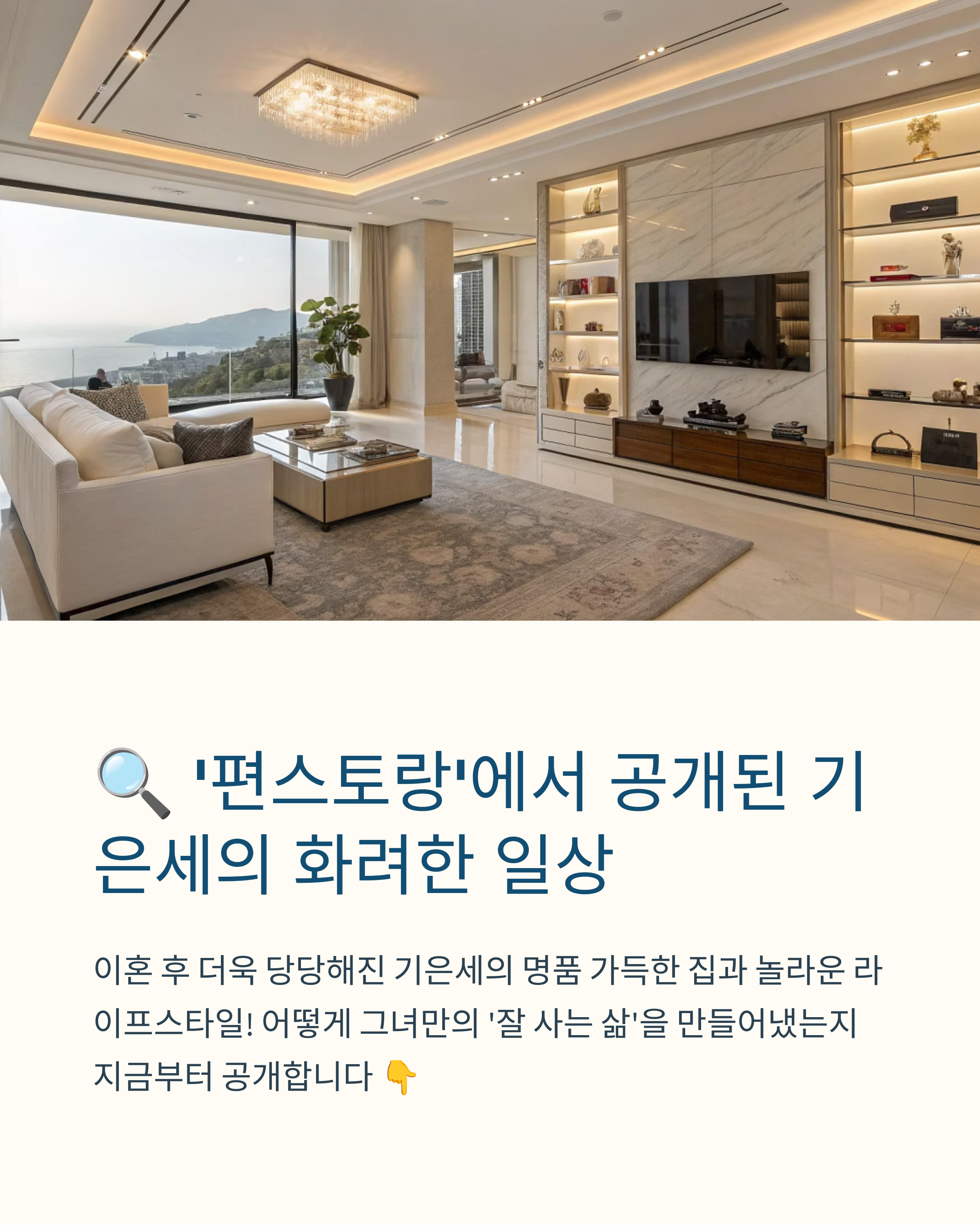 안녕하세요 여러분! 요즘 SNS에서 제일 핫한 인물, 기은세 씨 이야기 안 하면 섭섭하죠. 최근 KBS2 <편스토랑>에 출연하면서 그녀의 명품 하우스와 싱글 라이프가 공개돼 연일 검색어를 장악하고 있어요. 이혼 후 돌싱으로 돌아온 그녀, 그런데… 오히려 더 빛나고 있어요. 오늘은 기은세의 근황과 ‘편스토랑’ 출연 비하인드, 그리고 그녀의 프로필까지 낱낱이 파헤쳐볼게요. 솔직히 저도 방송 보면서 입 벌어졌답니다.