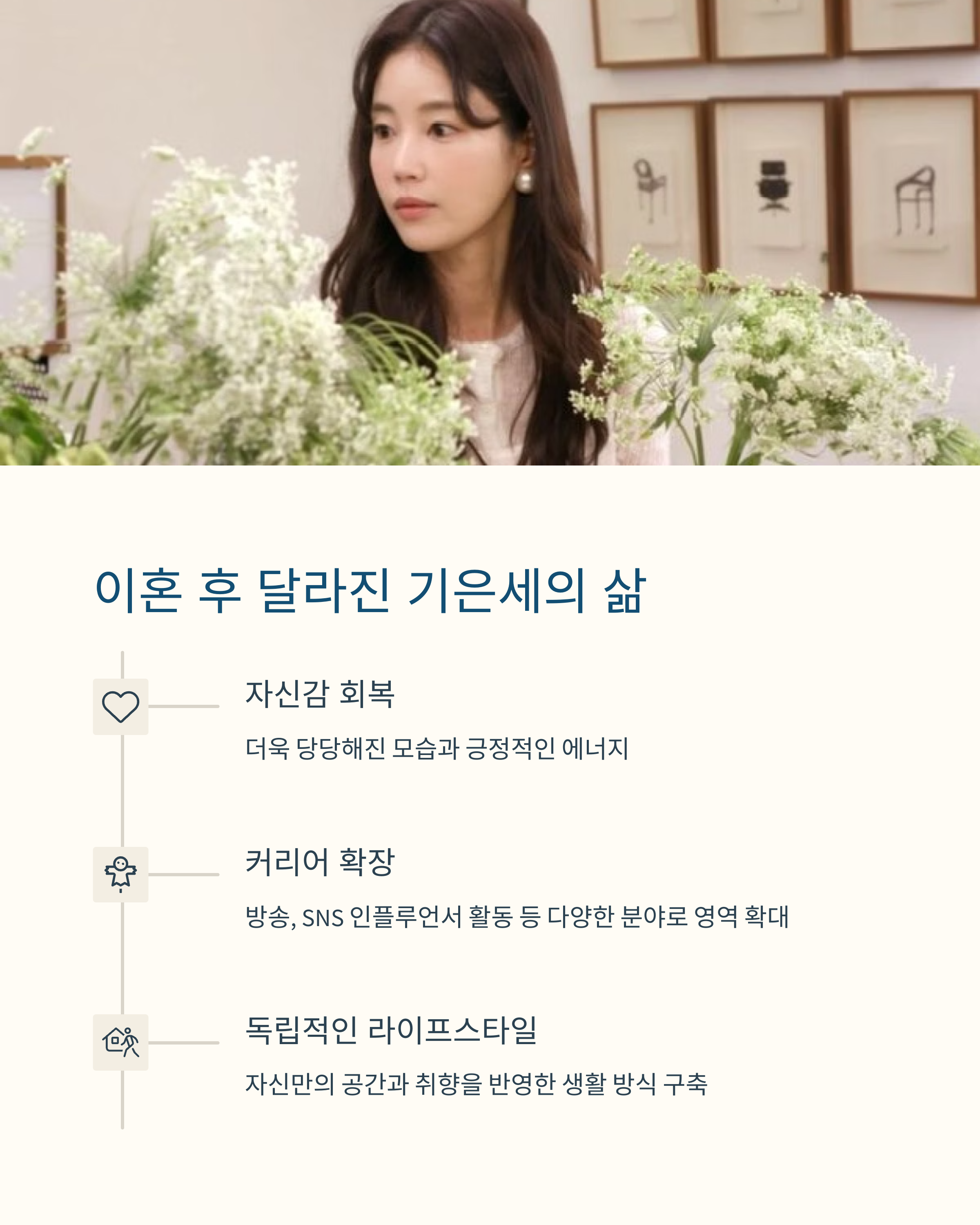 기은세는 2023년 말 조용히 이혼한 사실이 알려지며 많은 이들의 관심을 받았죠. 하지만 그 이후 그녀의 삶은 오히려 더 밝아졌다는 평이 많습니다. 본인의 라이프스타일을 있는 그대로 보여주며 ‘싱글라이프’의 새로운 롤모델이 되었어요. 최근 각종 인터뷰와 방송에서도 자신만의 일상 루틴을 공개했는데요, 아래는 그녀의 이혼 전후 주요 라이프 변화입니다.