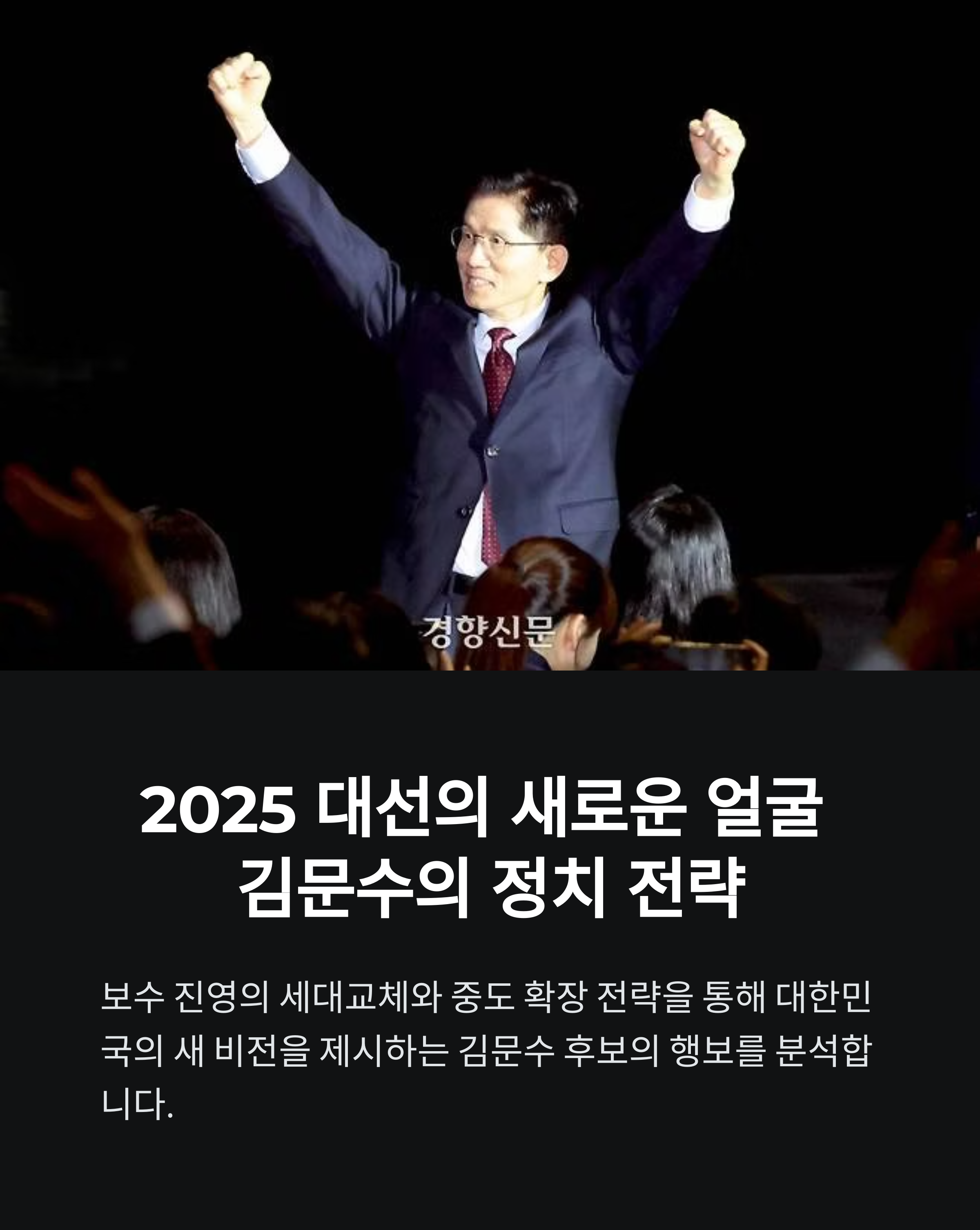 김문수 후보의 선출은 단순한 인물 교체를 넘어 보수 진영의 전략적 전환을 의미합니다. 특히 다음과 같은 전략적 기조가 예상됩니다: