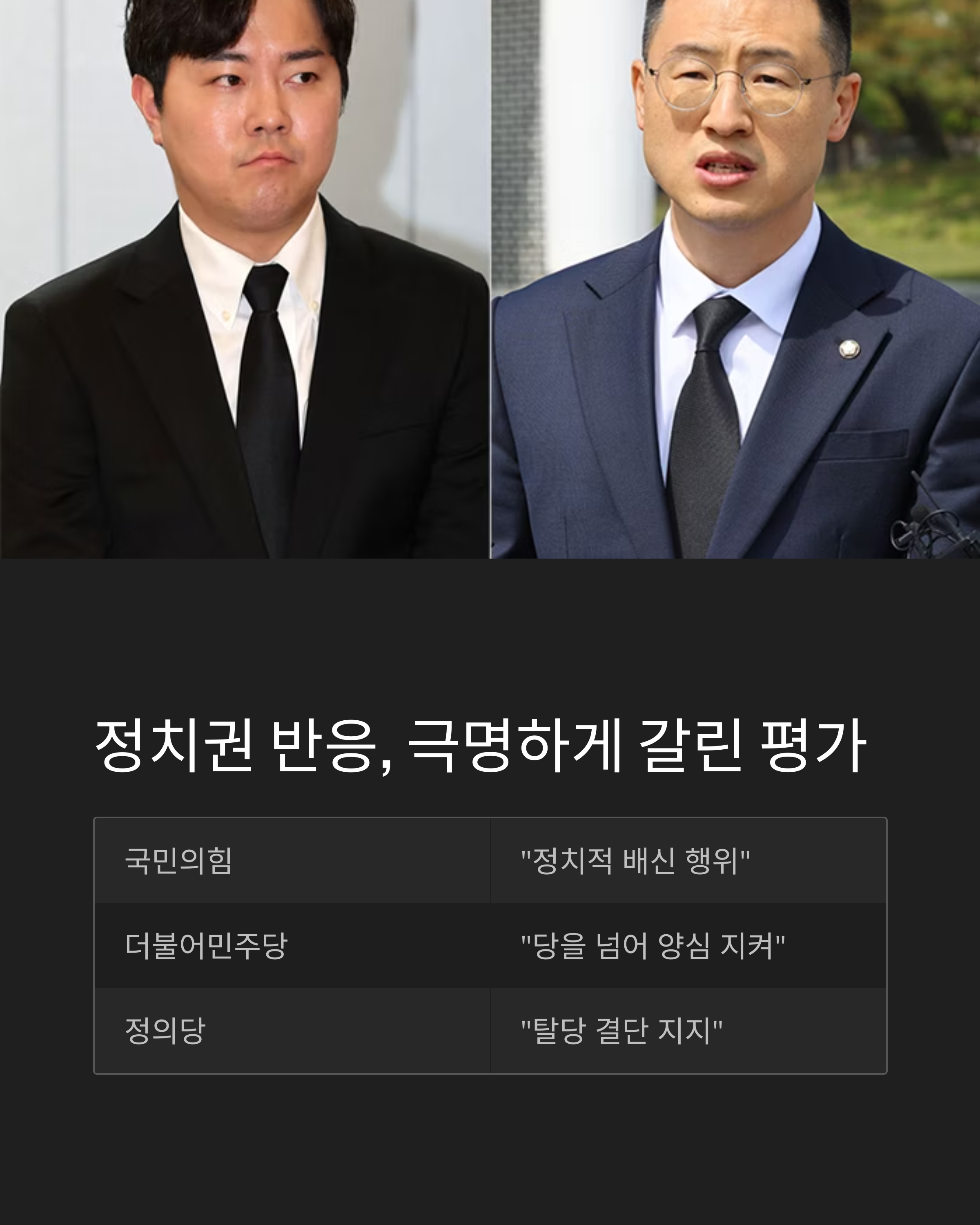 김 의원의 탈당은 국민의힘 내부에 일대 혼란을 야기했습니다. 일부 중도계 의원들은 “충분히 예상된 일”이라며 무덤덤한 반응을 보였지만, 강경 보수 진영에서는 “배신”이라는 강도 높은 비판이 쏟아졌습니다. 민주당과 정의당은 “정치적 용기”라는 평가를 내리며 김 의원을 우호적으로 평가했습니다.