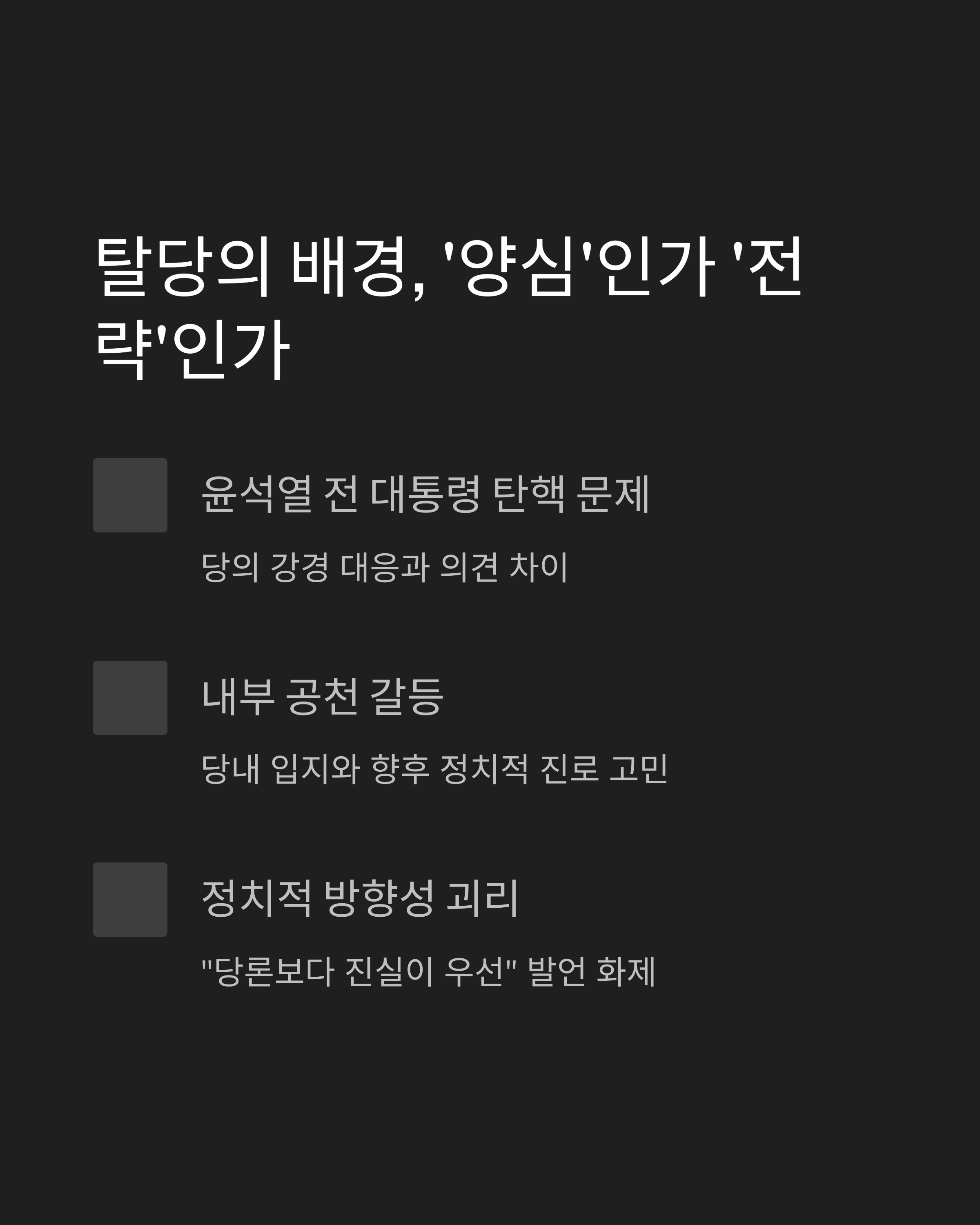 그는 당론보다 양심에 따른 정치를 강조하며, 국민의힘의 방향성과 갈등을 이유로 탈당을 결심했습니다. 윤석열 전 대통령 탄핵 문제 등 주요 쟁점에서 당과 의견 차이를 보인 점이 주요 원인입니다.