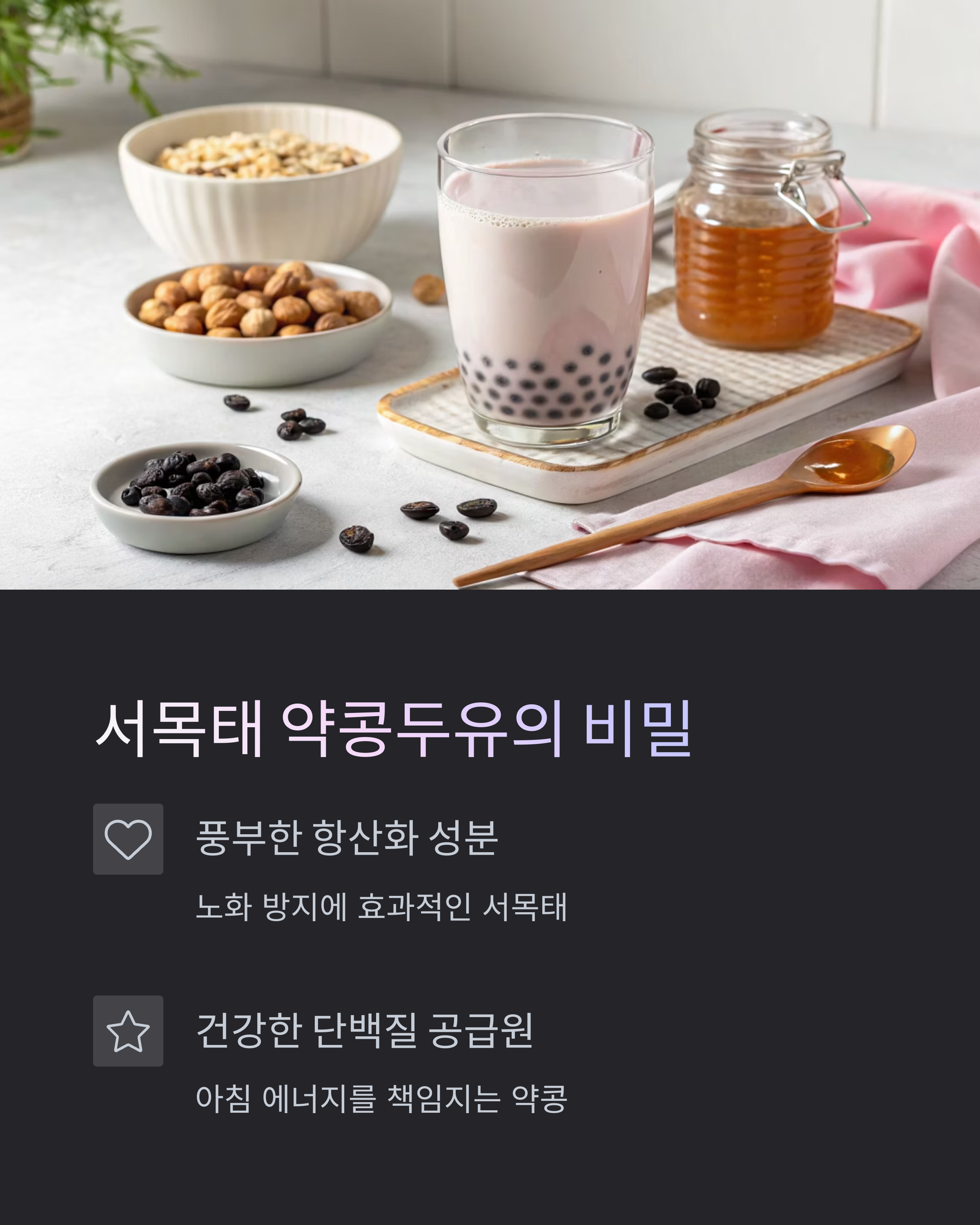 김성령이 섭취하는 ‘밥스누 서목태 약콩두유’는 쥐눈이콩(서목태)을 껍질째 통째로 갈아 만든 음료입니다. 항산화 성분인 안토시아닌이 풍부하고, 무가당·무첨가로 가볍게 즐길 수 있습니다.