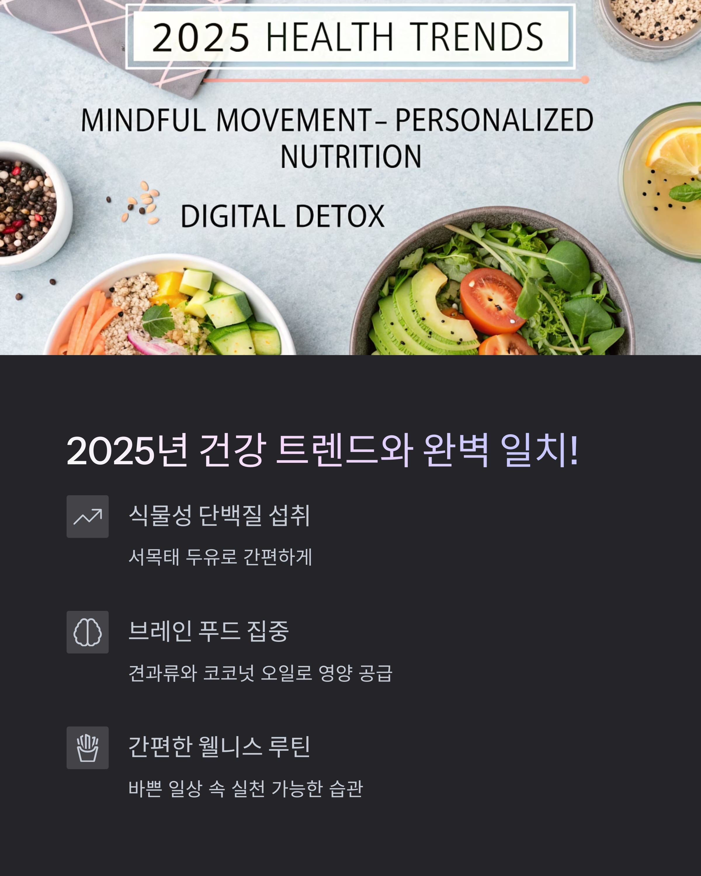 ‘무첨가’, ‘저가공’, ‘고기능성’, ‘간편함’이 2025년 건강 트렌드를 주도하고 있습니다.