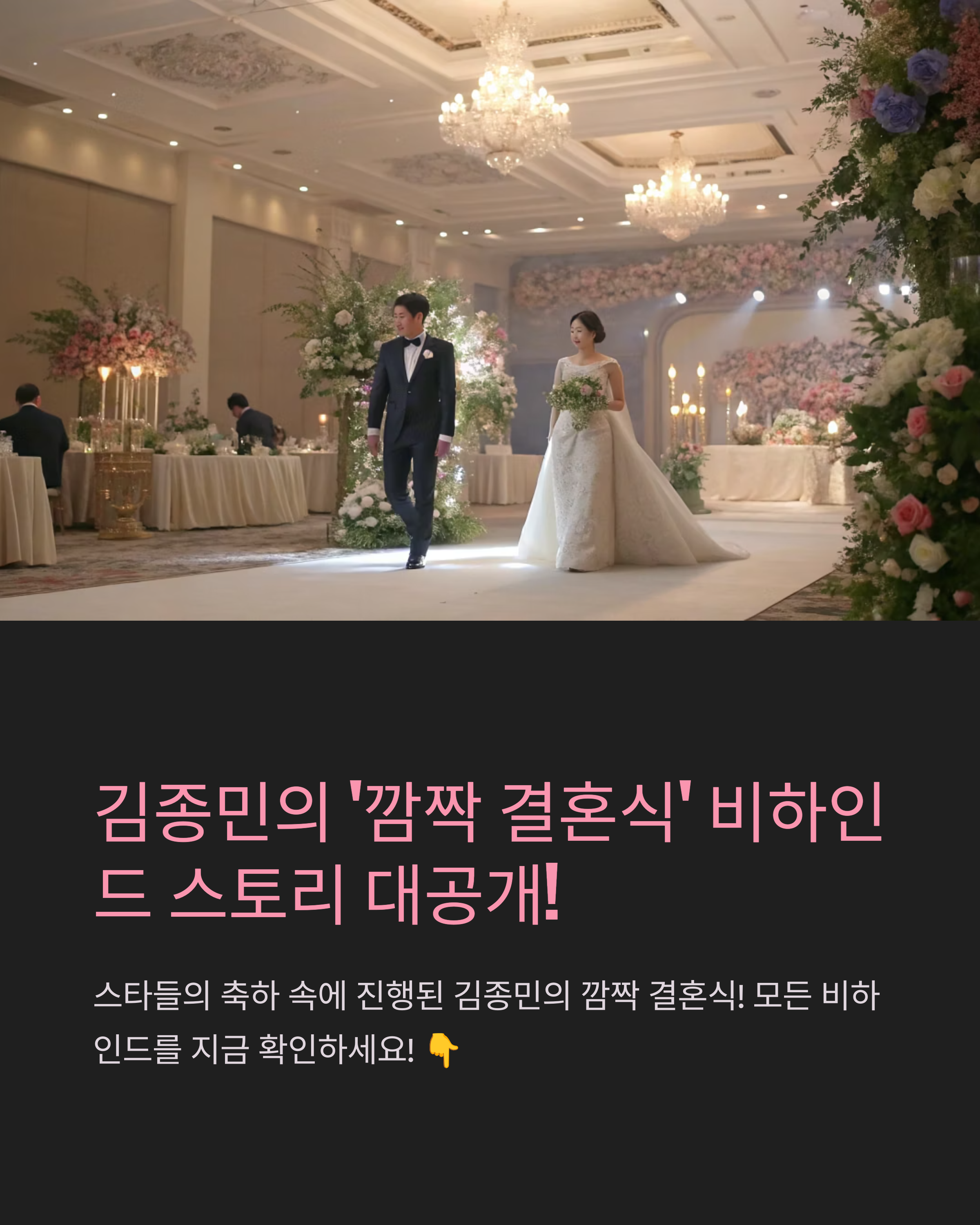 안녕하세요 여러분, 요즘 연예계 뉴스 보느라 밤잠 설치시는 분들 많죠? 저도 그중 한 명이에요. 이번 주는 특히나 핫한 소식이 많았는데요, 그 중에서도 단연 화제였던 건 바로 김종민의 결혼식이었습니다. 긴 시간 동안 '노총각 이미지'로 사랑받던 김종민 씨가 드디어 결혼이라니... 그리고 그 주인공이 바로 김휘수라는 분이라는 사실! 더 놀라운 건 얼굴이 공개되면서 온라인이 들썩였다는 거죠. 저도 사진 보고 깜짝 놀랐어요. 오늘은 이 이슈를 정리해볼게요.