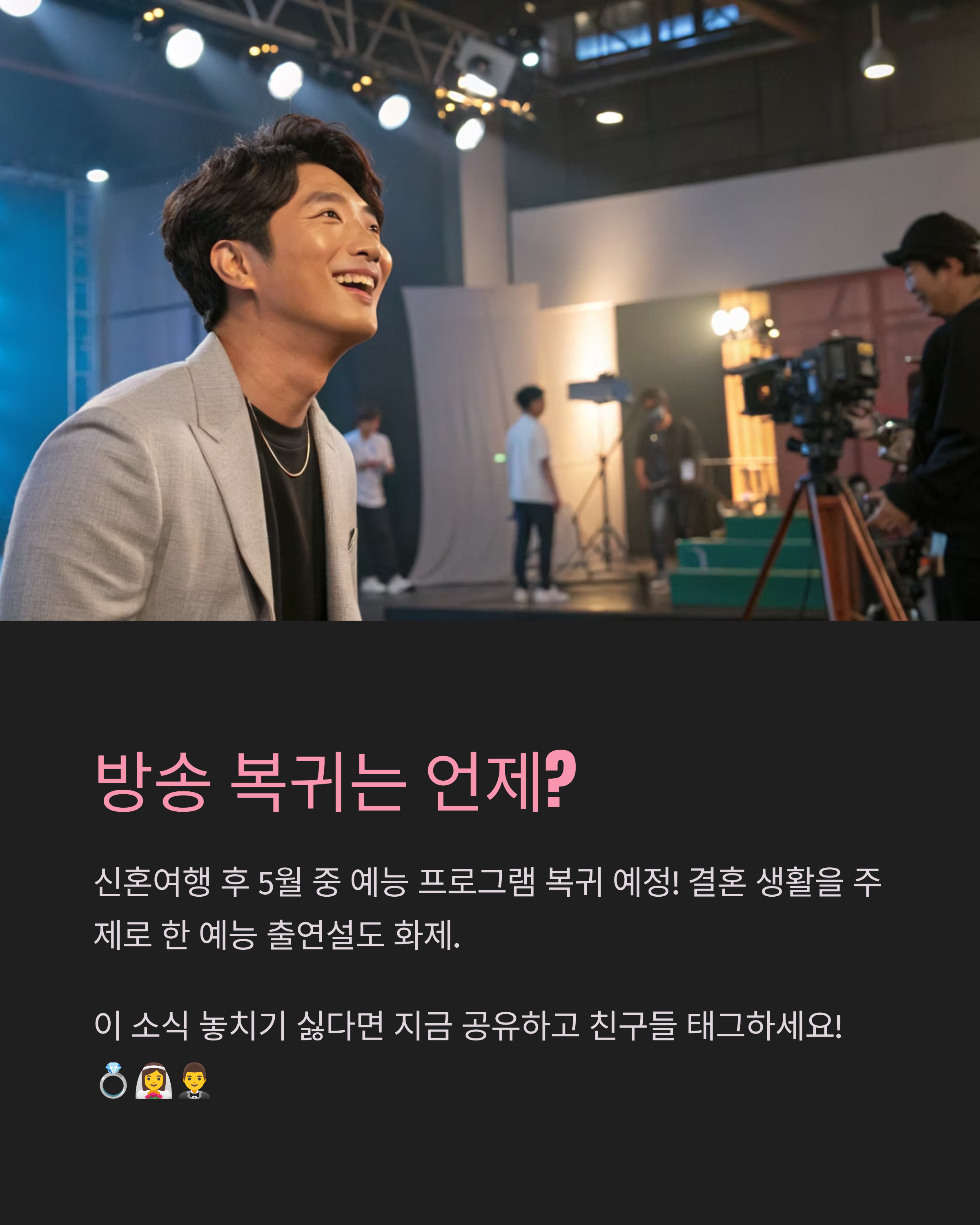 현재는 신혼 여행 이후 휴식기로 알려졌으며, 빠르면 2025년 가을 예능 프로그램을 통해 복귀할 것으로 예상됩니다.