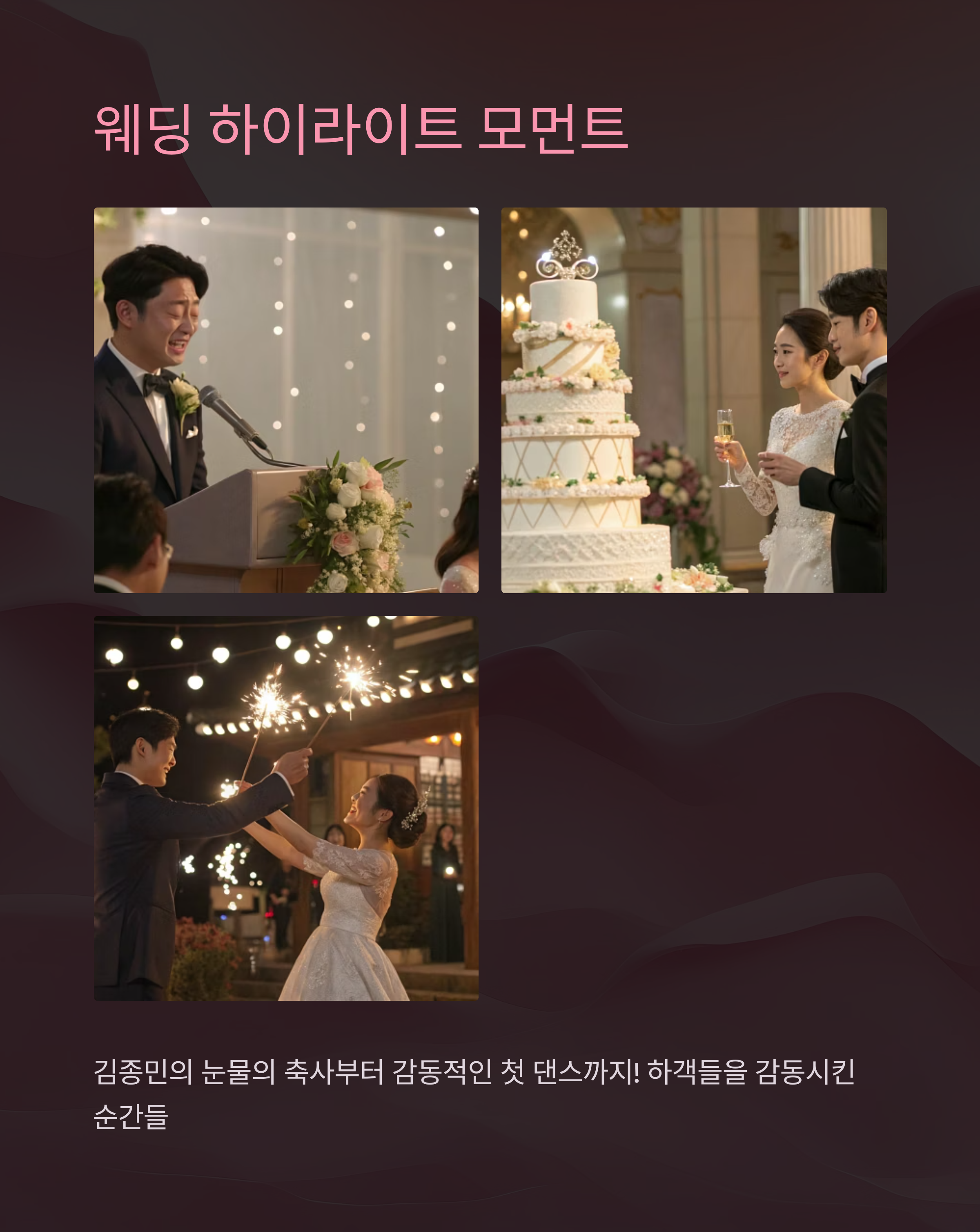 | 이찬원 | "축가 준비하면서 긴장 엄청 하시더라구요. 그래도 라이브는 완벽했어요!" |