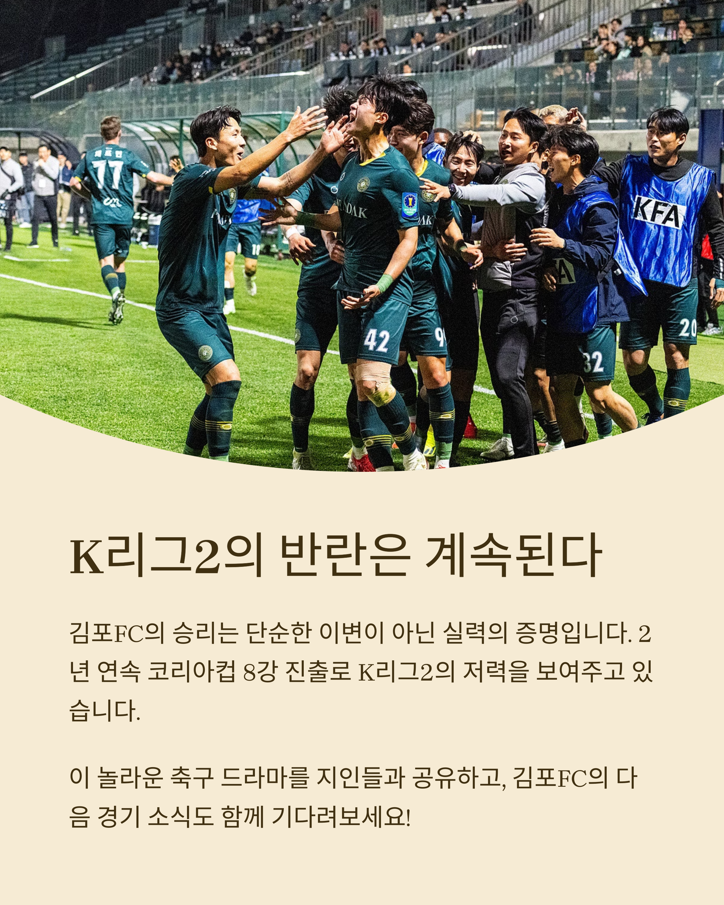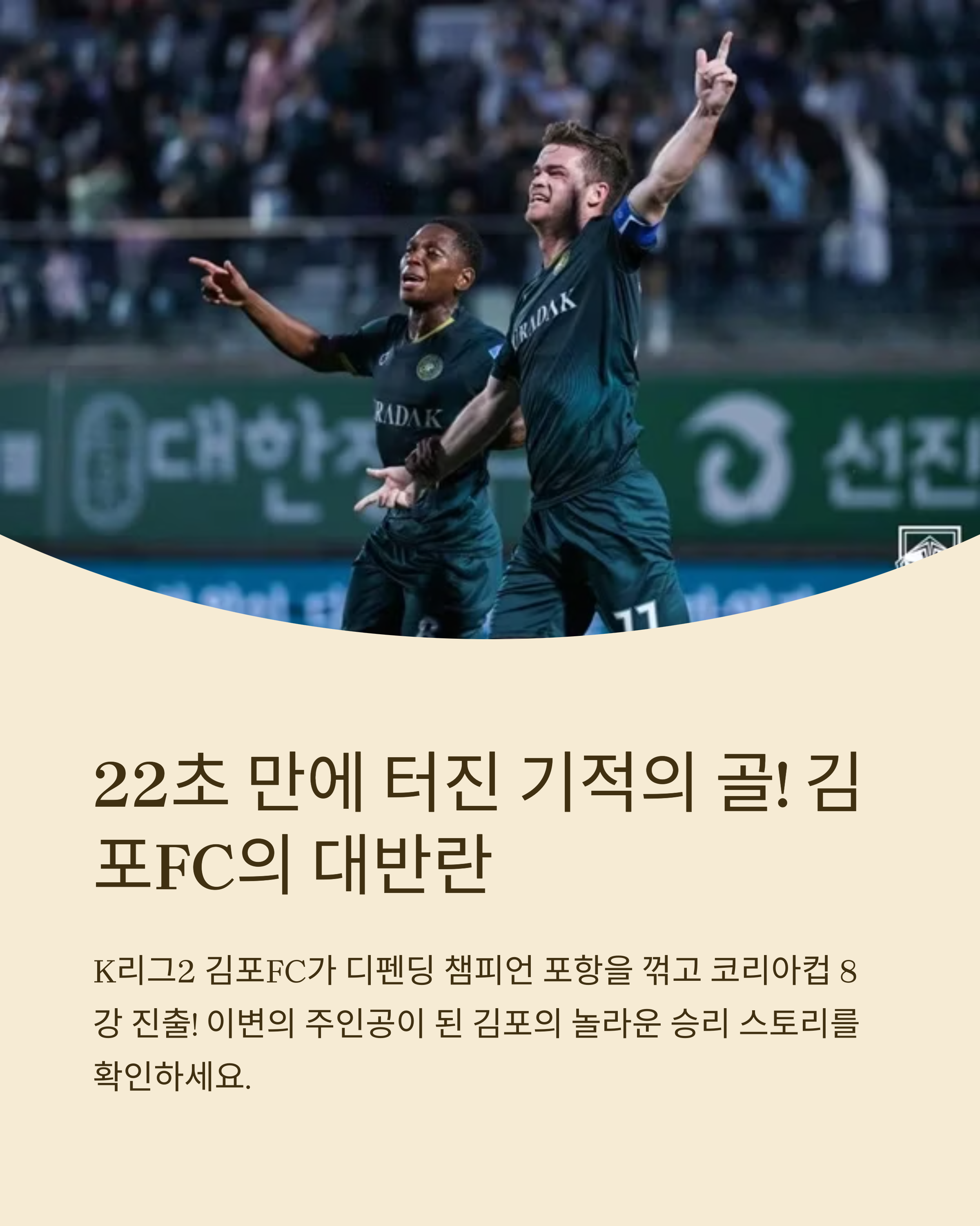 앞으로 남은 코리아컵 여정에서도 김포FC가 어떤 반란을 보여줄지 기대해보며, 다음 포스팅에서는 '부천FC의 8강 진출 스토리'를 소개할 예정이니 많은 관심 부탁드려요!