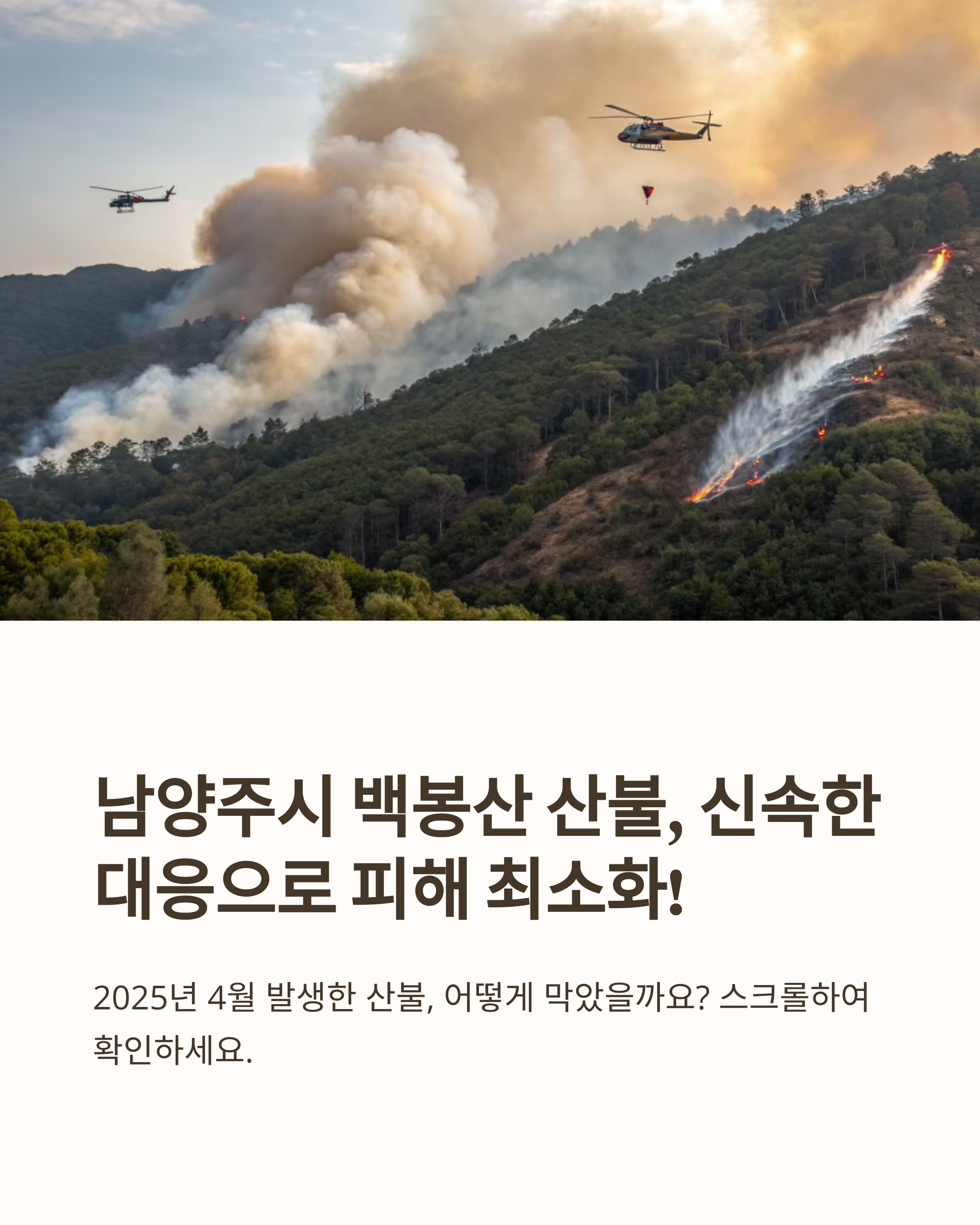 안녕하세요. 지역 이슈와 행정 대응에 관심 많은 시민 기자입니다. 최근 백봉산에서 또다시 산불이 발생했다는 속보에 많은 시민들이 놀라셨을 텐데요. 저 역시 뉴스를 접하고 걱정이 앞섰습니다. 그런데 현장에서 직접 진두지휘에 나선 사람이 있었으니, 바로 남양주시의 주광덕 시장입니다. 빠른 판단과 민첩한 대응으로 산불 확산을 막기 위한 총력전을 벌이고 있다는 소식, 오늘 이 글에서 자세히 전해드릴게요.