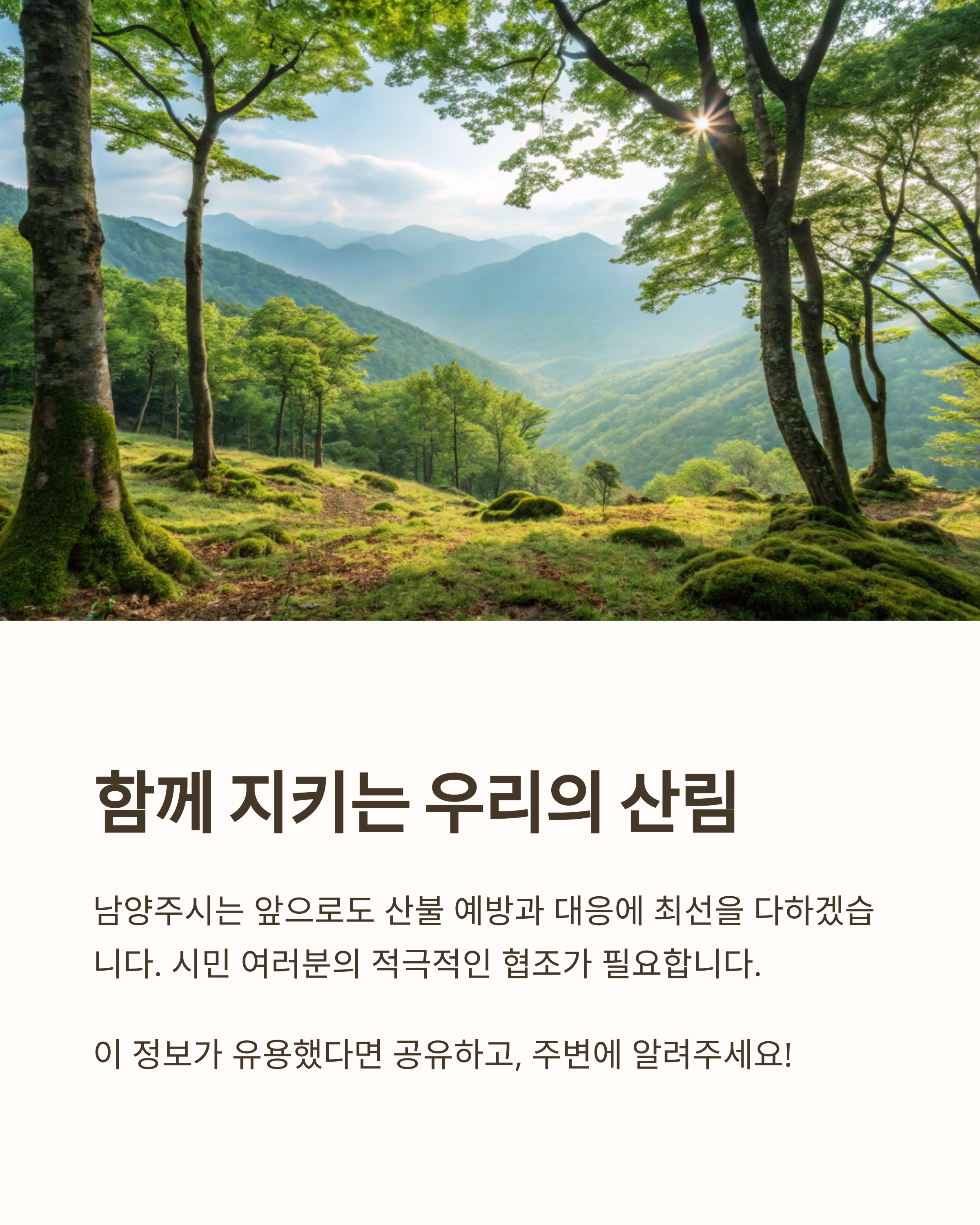 남양주시는 드론 감시 확대, 감시원 증원, 시민대응 매뉴얼 배포 등 산불 대응력을 강화하고 있습니다.
