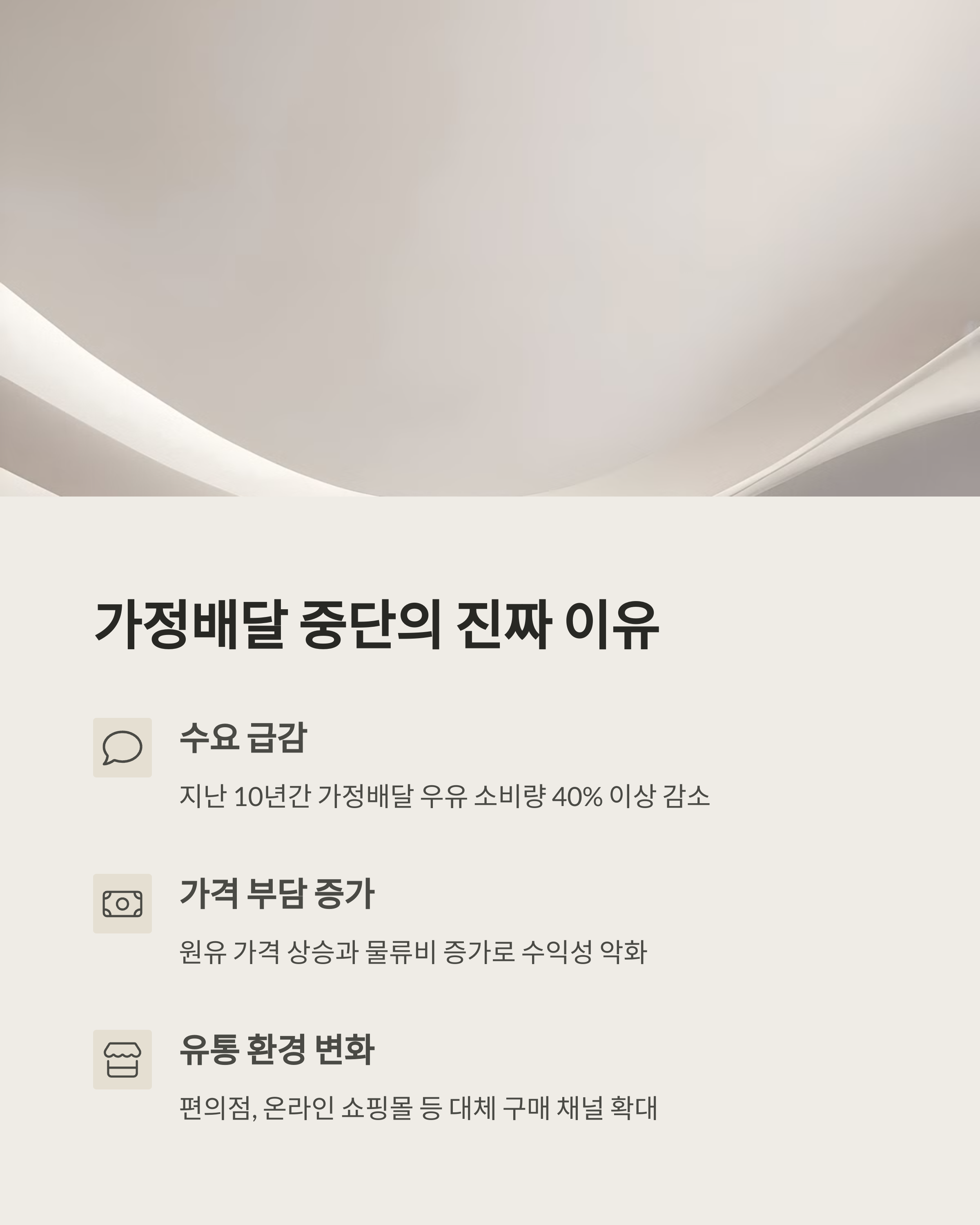 실제로 국내 우유 매출은 최근 5년간 꾸준히 하락세를 보이고 있어요. 생산 원가는 오르는데, 소비는 줄고, 유통비용은 감당이 안 되니 악순환이 반복되고 있는 구조죠. 특히 ‘가정배달’이라는 포맷은 인건비, 물류비 등 고정비 부담이 높아 더 이상 유지하기 어려운 상황이 된 겁니다. 아래 리스트는 최근 3년간 주요 지표들을 정리한 거예요.