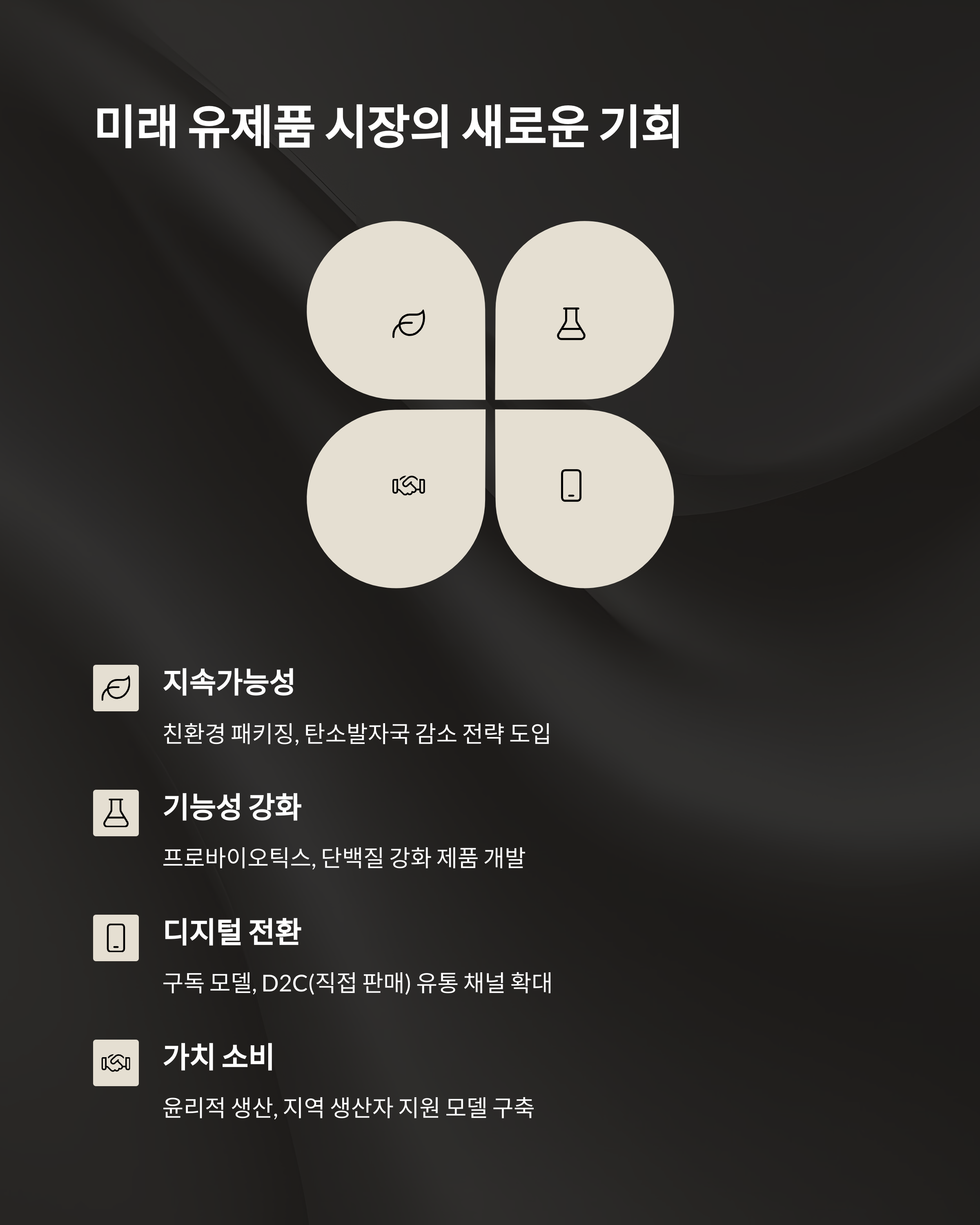 식물성 음료 라인 확대, 프리미엄 제품 개발, 온라인 유통 강화 등 다각도로 사업 전환을 추진 중입니다.