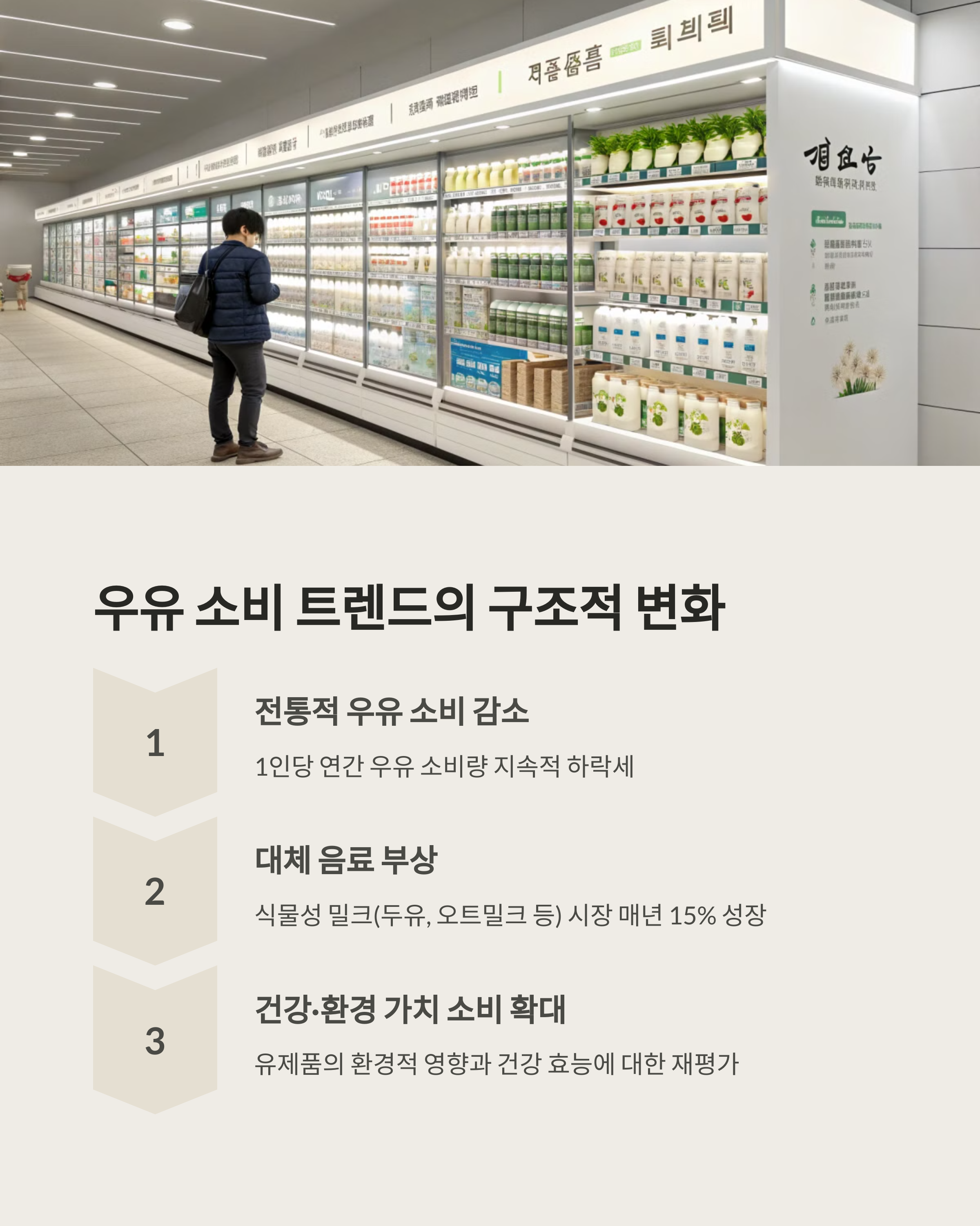 | 소비 패턴 변화 | 우유보다 아몬드밀크, 두유, 요거트 등으로 이동 |
