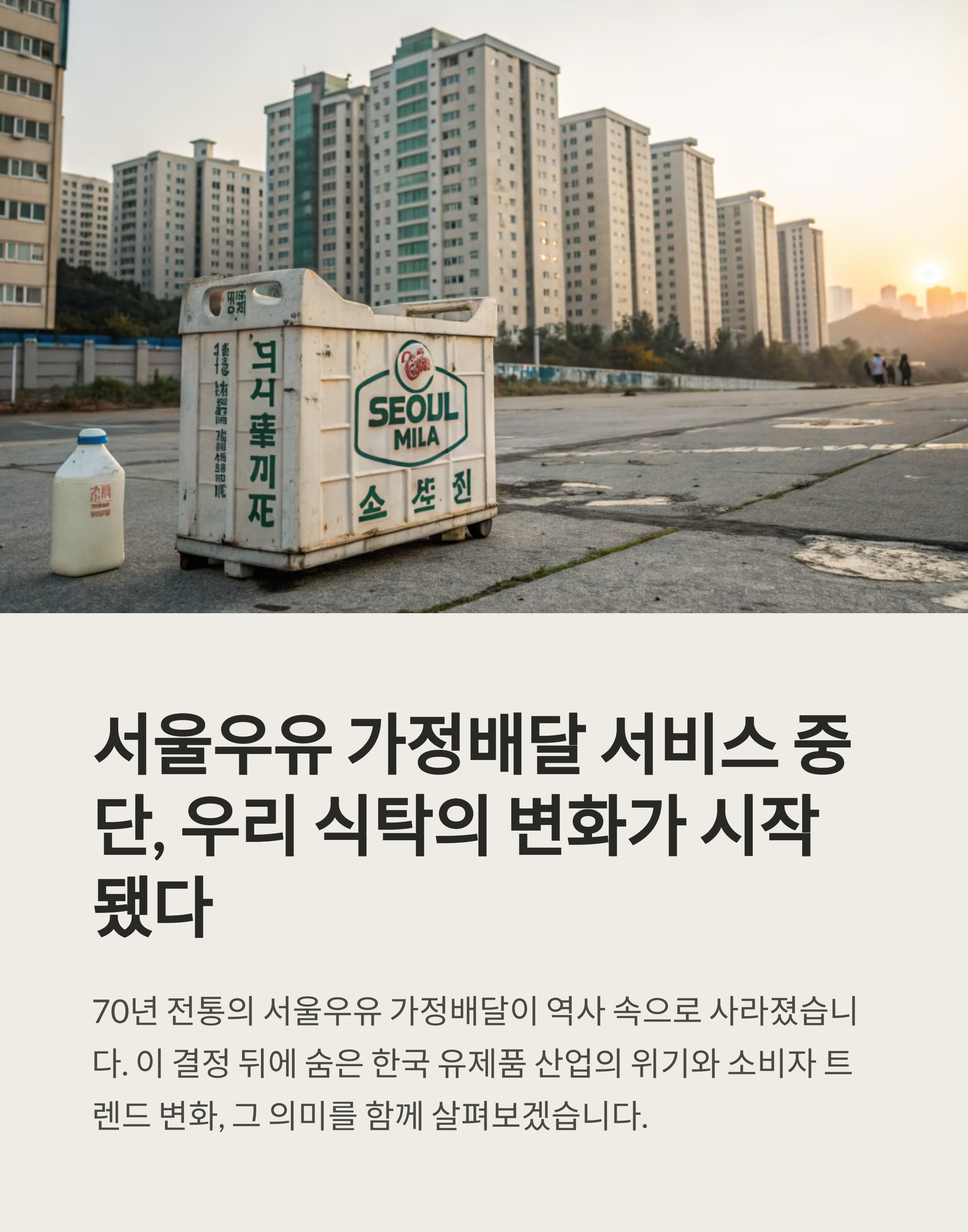 서울우유협동조합이 최근 발표한 결정은 말 그대로 ‘중대 결단’이었습니다. 유제품 업계에서 상징처럼 여겨졌던 ‘서울우유 가정배달 서비스 전면 중단’. 불황과 수요 감소, 그리고 물가 상승 속에서 유통 구조 효율화를 위해 고심 끝에 내린 선택이었죠. 단순한 서비스 종료가 아닌, 한국 유제품 유통 역사에서 중요한 전환점으로 해석됩니다. 수십 년간 이어져 온 우유 배달통이 이제 역사 속으로 사라진다는 점에서, 산업의 패러다임이 변하고 있다는 신호로 보입니다.