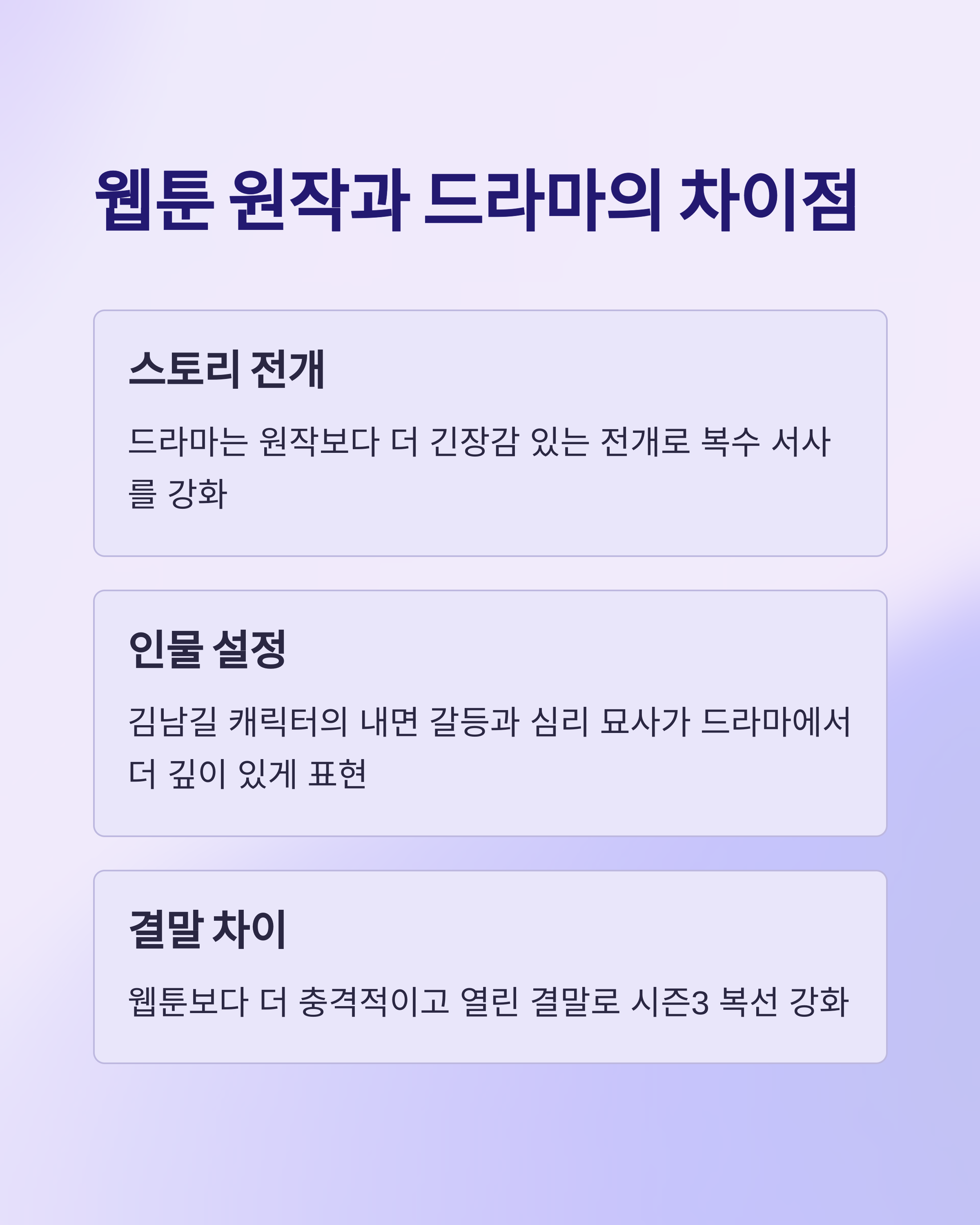 각자의 매력이 다릅니다. 원작은 디테일한 심리 묘사가, 드라마는 배우들의 감정 연기가 강점이에요.