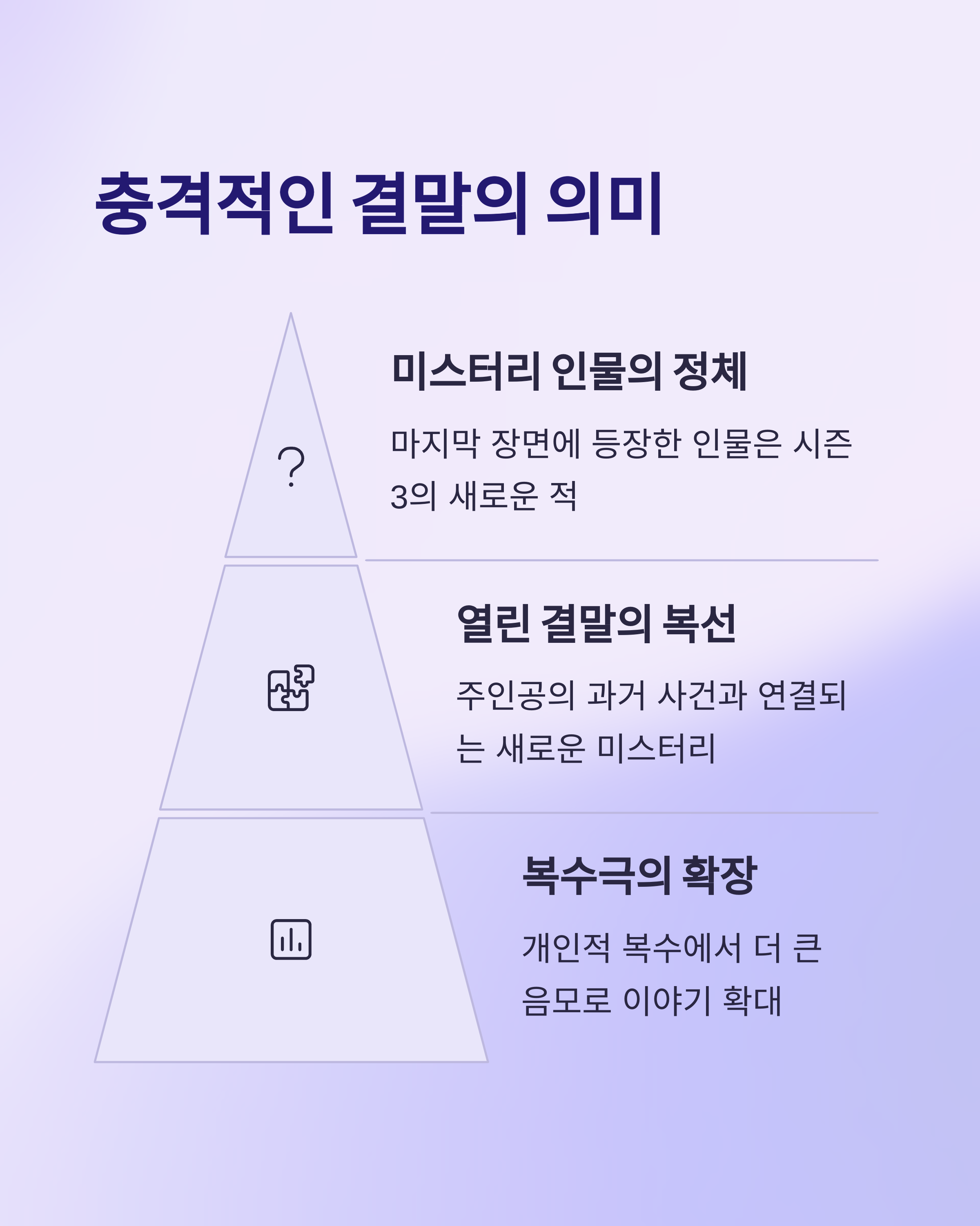 결말의 열린 구성이 많은 팬들로 하여금 ‘시즌3 나오는 거 아니야?’라는 기대를 품게 만들었죠. 특히 다음 시즌으로 이어질 가능성을 암시하는 설정 몇 가지를 정리해보면 이렇습니다: