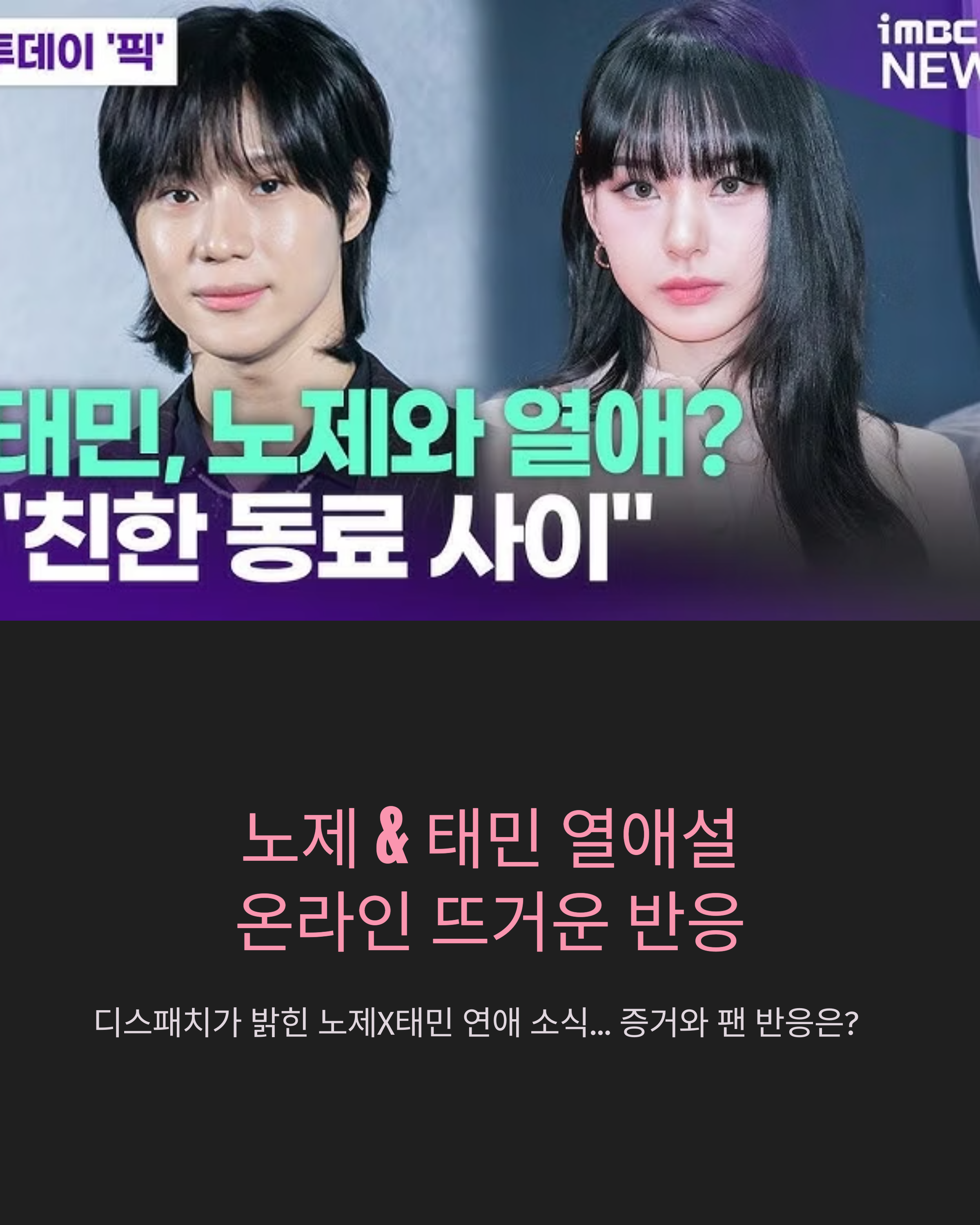 앞으로 추가 보도나 양측의 공식 입장이 또 나올 가능성도 있죠. 곧 공개될 태민의 단독 콘서트와 노제의 프로젝트도 주목받고 있는 만큼, 열애설이 어떤 방향으로 흘러갈지 지켜보는 것도 흥미로울 거예요. 그럼 다음 이슈에서 또 만나요!