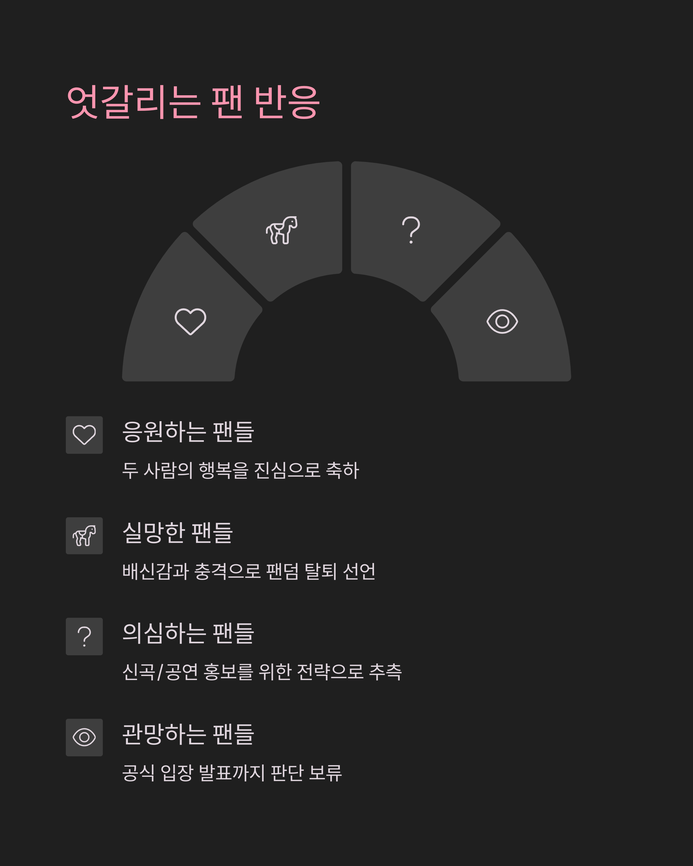 지지하는 팬들과 반대하는 팬들 사이 의견이 엇갈리고 있습니다. 일부는 “행복하다면 괜찮다”는 입장이고, 일부는 “배신감을 느꼈다”는 반응을 보이고 있어요.