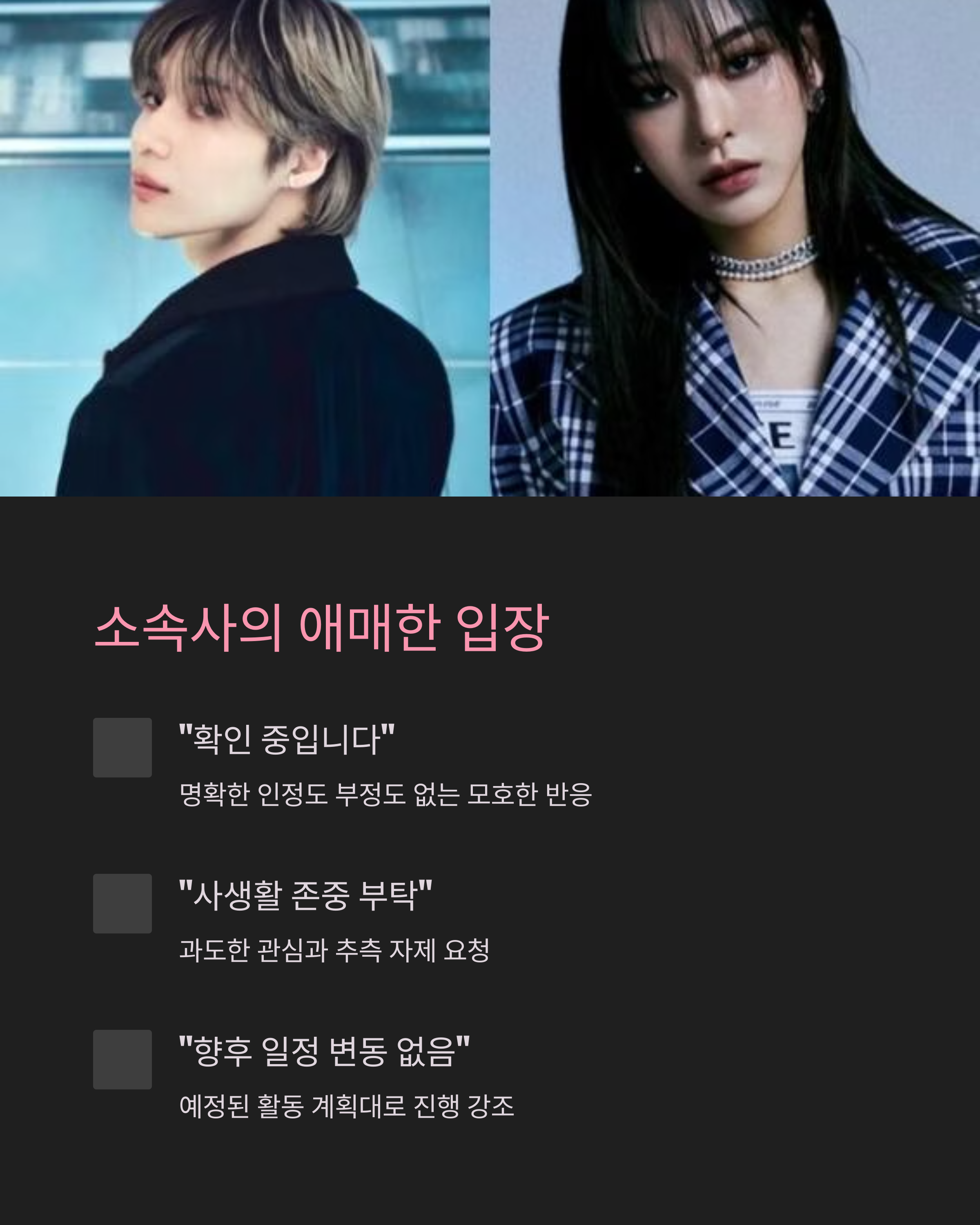이처럼 양측 소속사는 다소 조심스러운 입장을 취했지만, 명확한 해명이라기보다는 '회피성 답변'이라는 지적도 있어요. 공식 입장이 팬들의 의문을 해소하기에는 부족했다는 분위기가 강합니다.