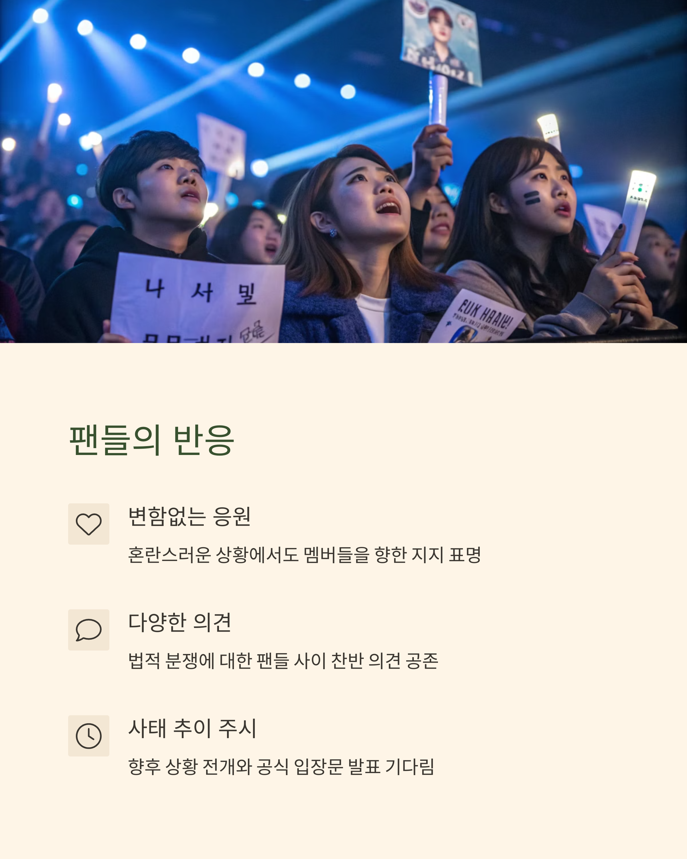 팬덤 내부에서도 의견이 엇갈리고 있지만, 공통적으로 ‘멤버 보호’에 대한 목소리는 분명합니다. 법적 분쟁이 장기화될수록 팬들의 피로도는 커질 수밖에 없어요.