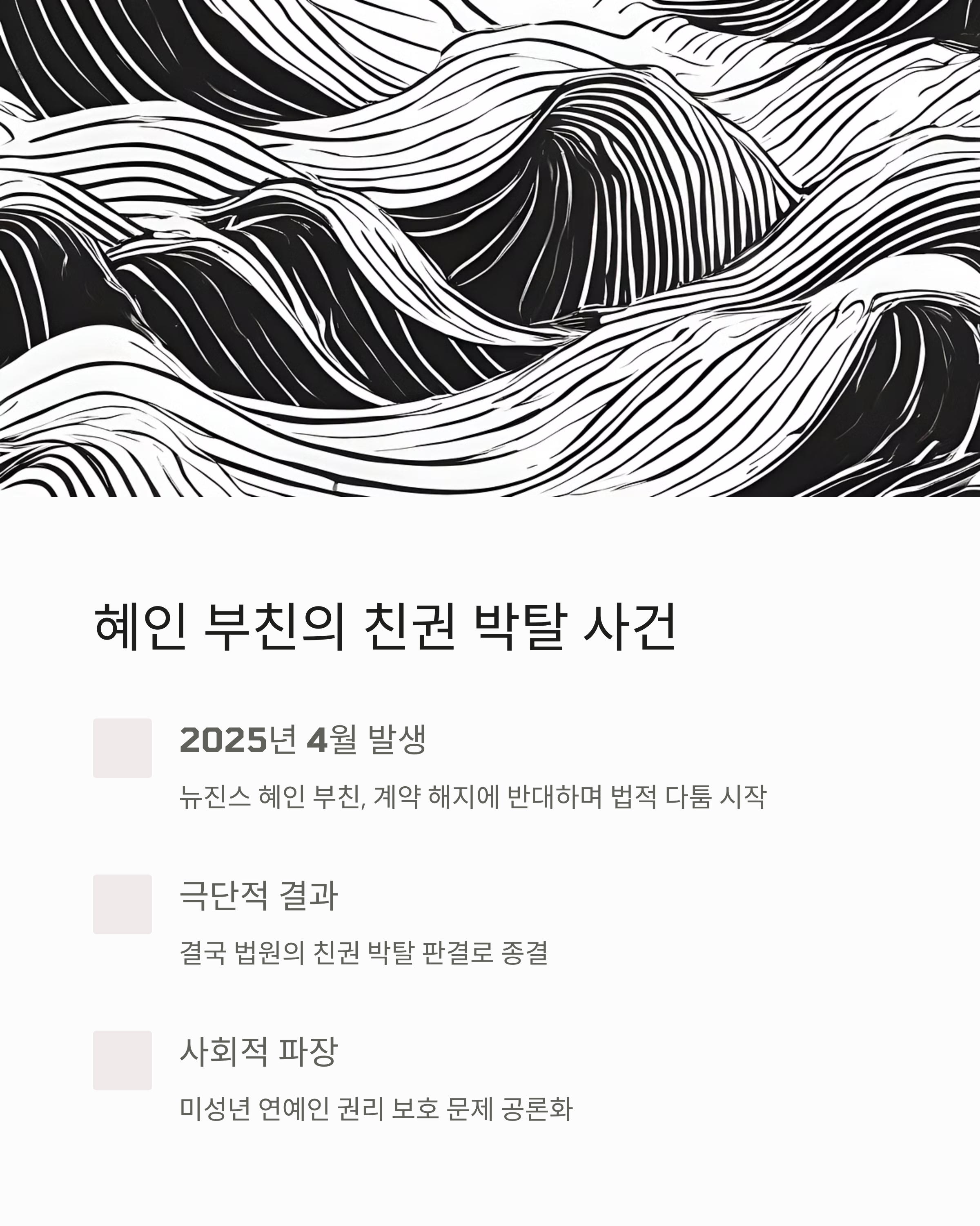 2025년 4월 초, 뉴진스 멤버 혜인의 부친이 법원으로부터 친권을 박탈당했다는 소식이 전해지면서 연예계와 팬들 사이에 큰 충격을 안겼습니다. 사건의 발단은 혜인이 소속된 어도어와의 계약 해지 문제로, 혜인의 부친이 이 결정을 반대하며 법적 분쟁으로까지 번진 것입니다. 법원은 혜인의 의사를 존중하며 부친의 강압적인 태도를 이유로 친권을 제한했고, 결국 어머니 측으로 친권이 이전됐습니다.
